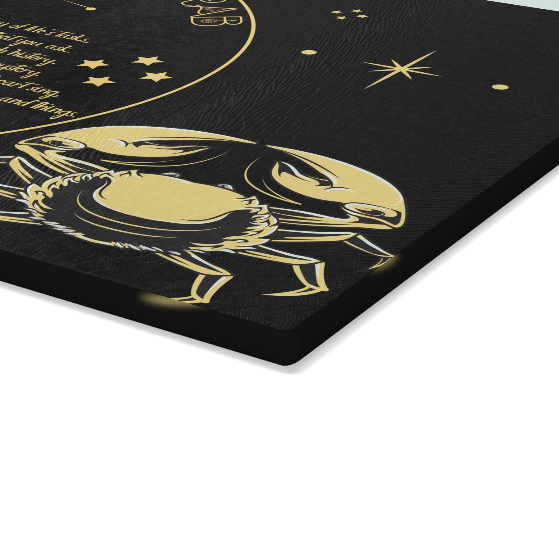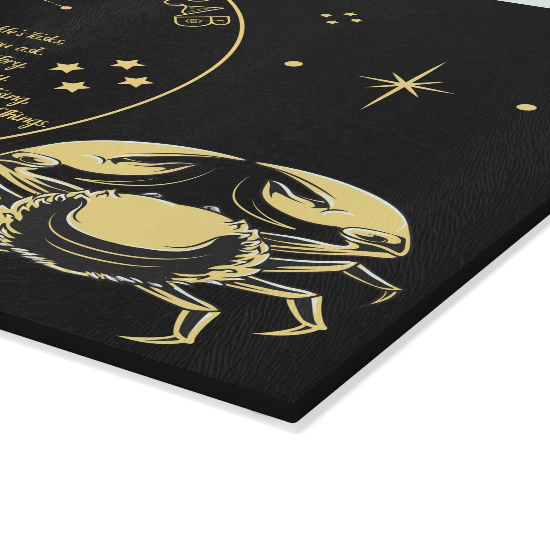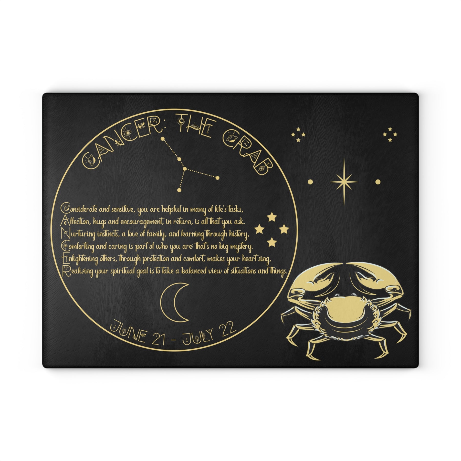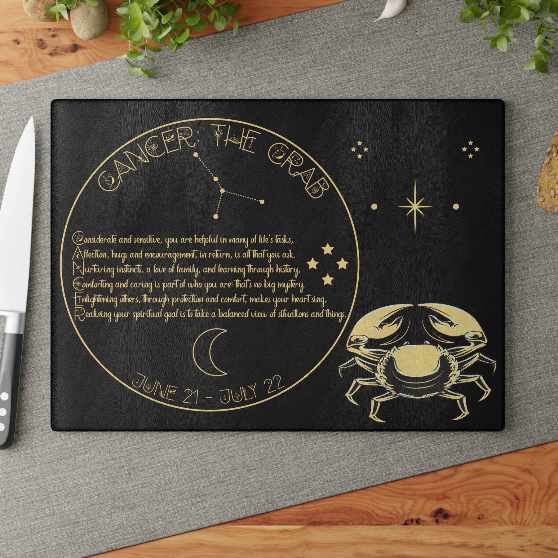 Add some personality to your kitchen with a custom glass cutting board from our Written in the Stars collection. The board features a poem spelling out Cancer, accompanied by a Cancer the Crab graphic and Celestial Font. The poem embodies the spiritual goal and traits associated with your sign. Made from durable tempered glass, it stands up to years of meal prep. The textured surface is perfect for chopping, slicing, and dicing. Four rubber feet keep it steady on your counter. Choose from two sizes: 8" x 11" or 11" x 15". For best results, hand wash only.