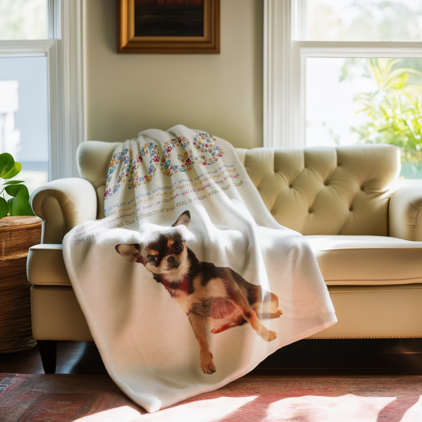 Adventure awaits with this plush, velveteen Chihuahua blanket! Indulge in ultimate comfort while being inspired by the acrostic poem (spelling out "Dogs") and paw print-and-bone font design. It's a bold and daring gift for any pup-lover in your life! Perfect for birthdays or Christmas! Get ready to take on the world with this incredible blanket!
