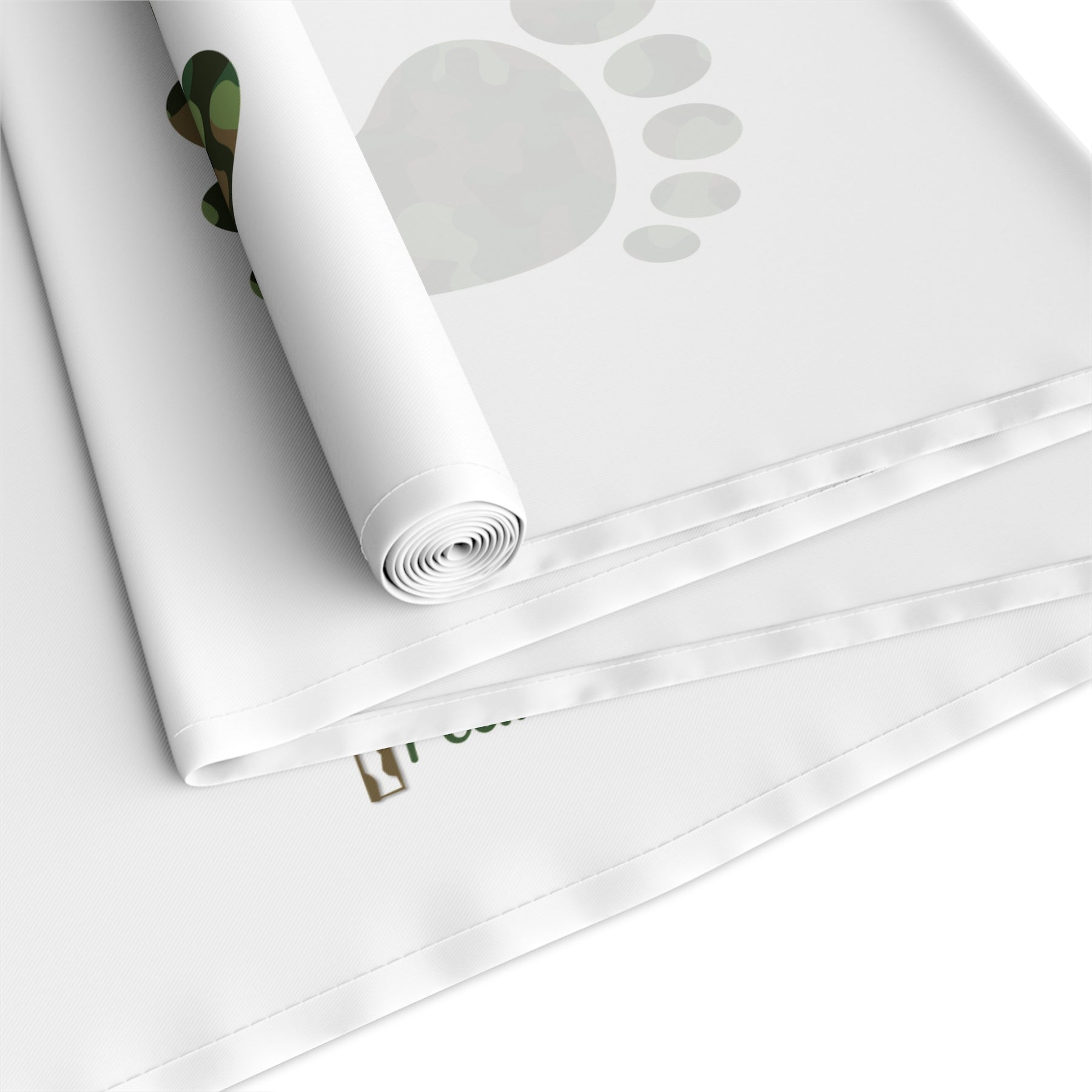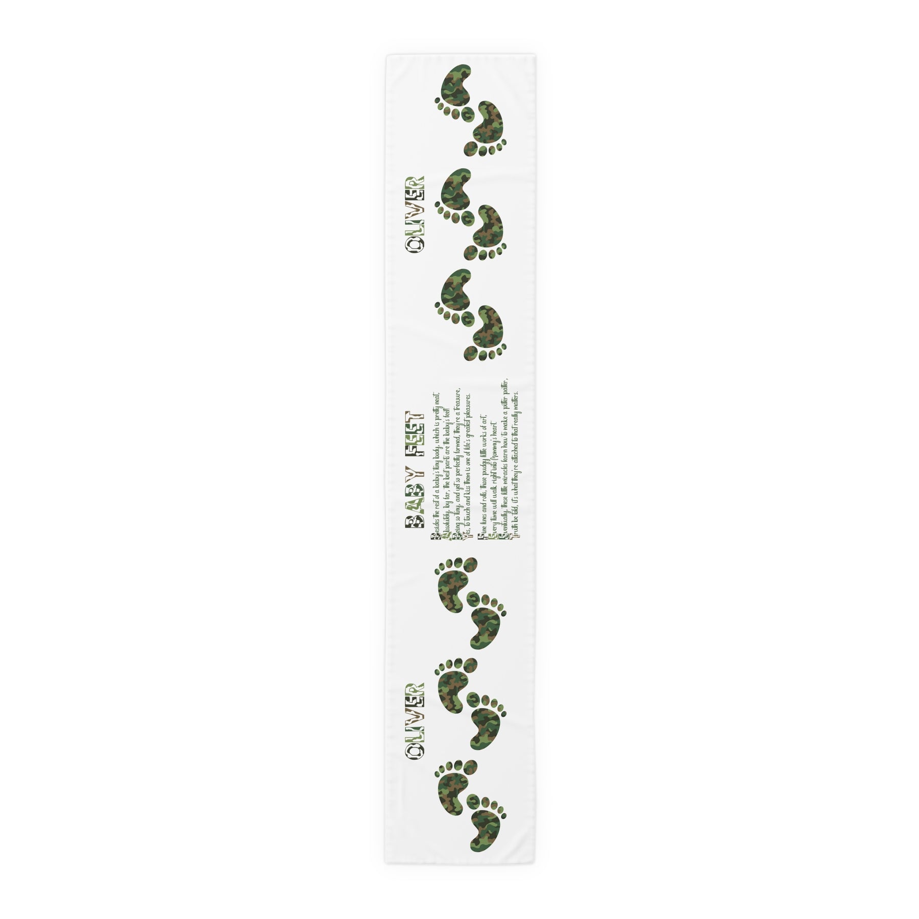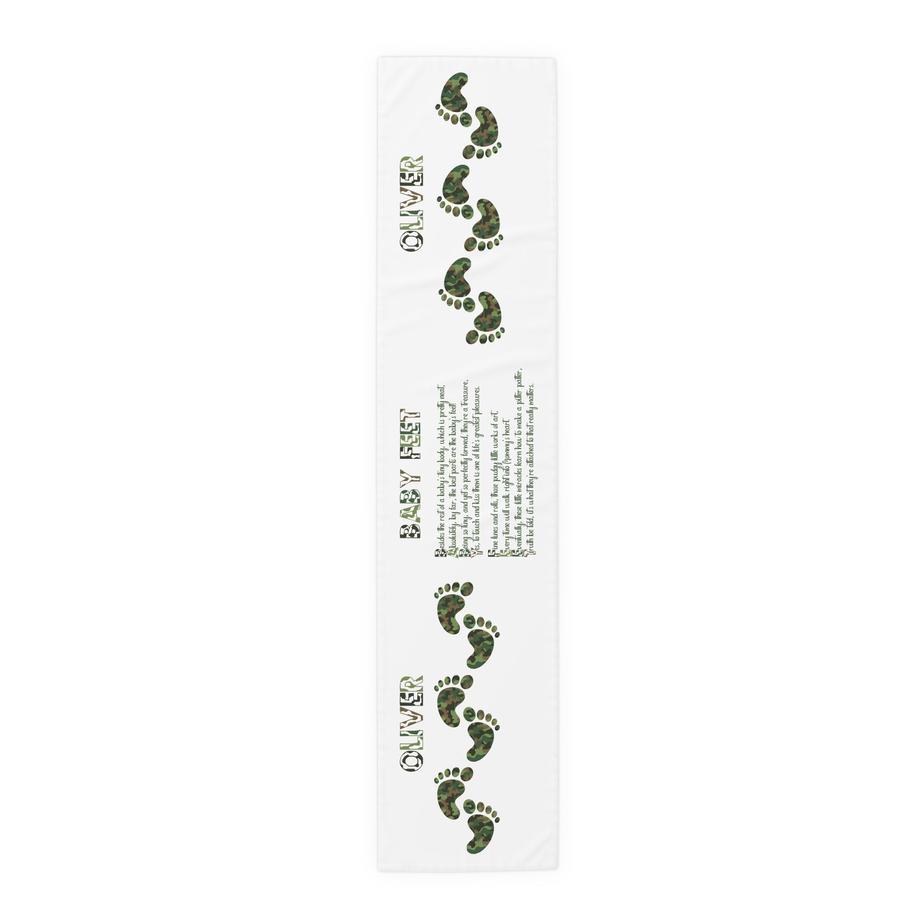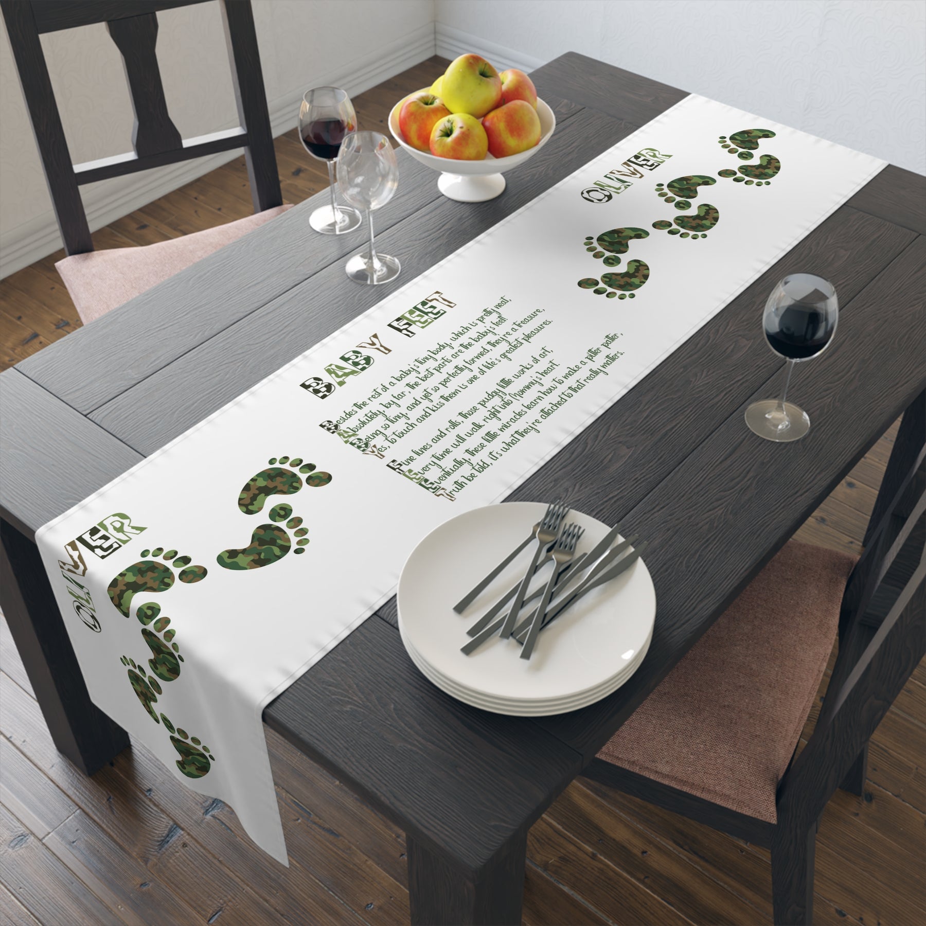 Elevate any baby shower decor with our "Baby Steps" stylish table runner, with an acrostic poem spelling out "Baby Feet", and a precious Camo baby feet and font design. It's available in either cotton twill or polyester. Perfect for adding a pop to the table setting, this runner is ideal for creating a fun atmosphere at any baby shower. To personalize this table runner, add the baby's first name at checkout. We'll take care of the rest.
