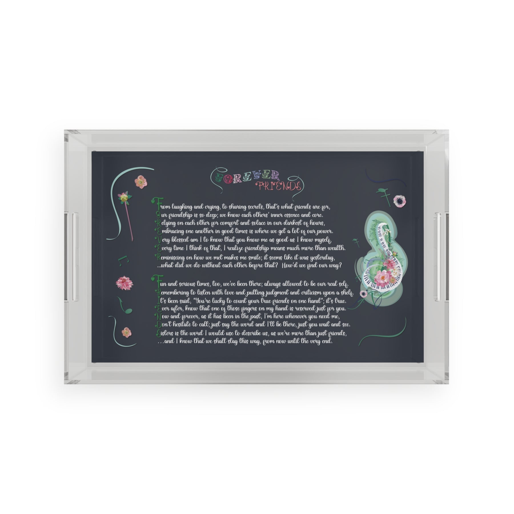 Give your BFFie something unique for their abode with our It’s Just a Phrase acrylic serving tray, featuring an acrostic poem that spells out Forever Friends. This tray is great for entertaining and adds a stylish touch to your table. The beautiful artwork underneath features a unique design, perfect for parties, dinners, or serving snacks. If your Bestie enjoys hosting, whether it’s Christmas, Thanksgiving, or a casual night with friends, this tray is a great choice. It brings both charm and elegance to a home, helping make every meal feel special. The tray measures 11" × 17" to suit different needs. It features a laminated artwork insert for an eye-catching appearance, and the design is printed on a white base for vibrant colors.