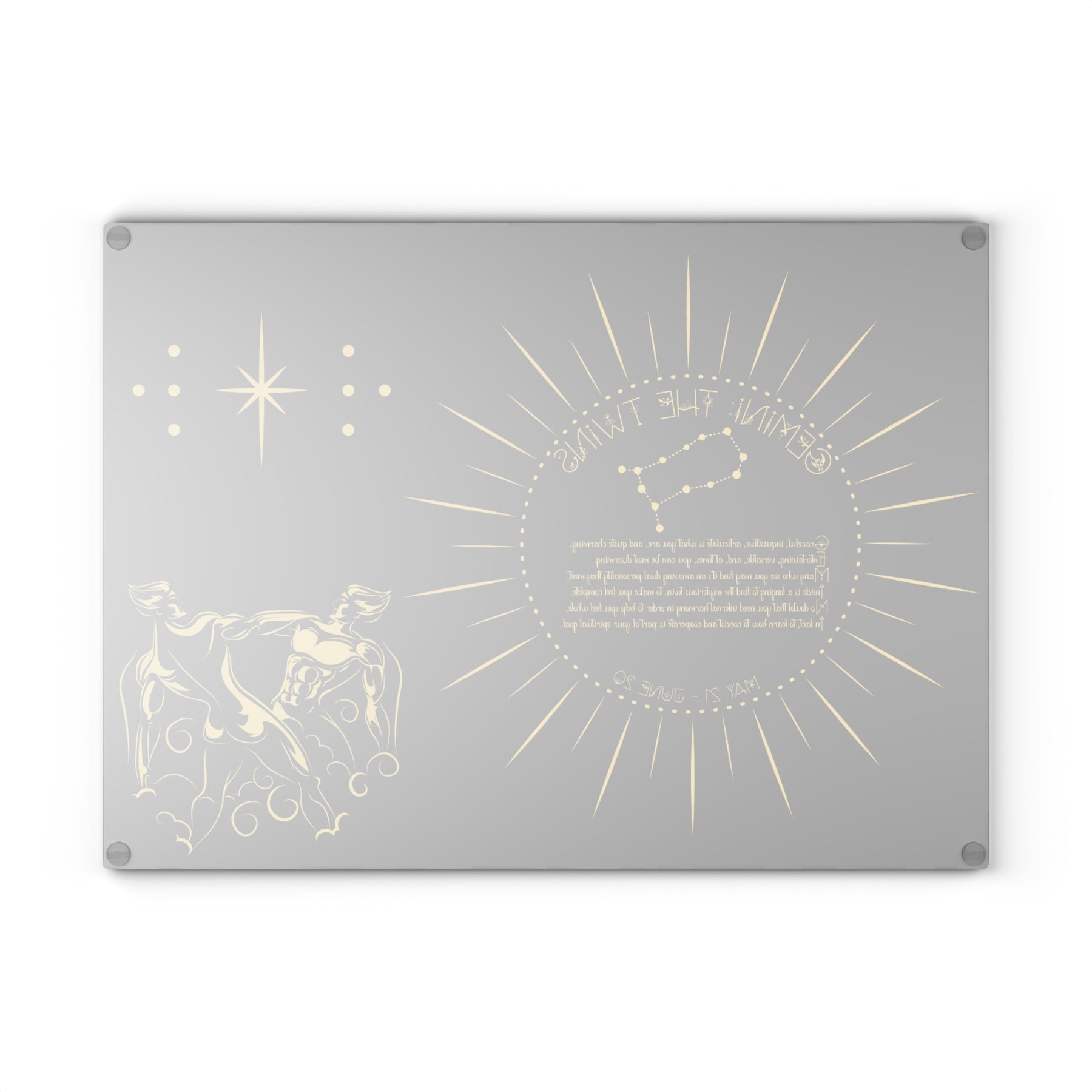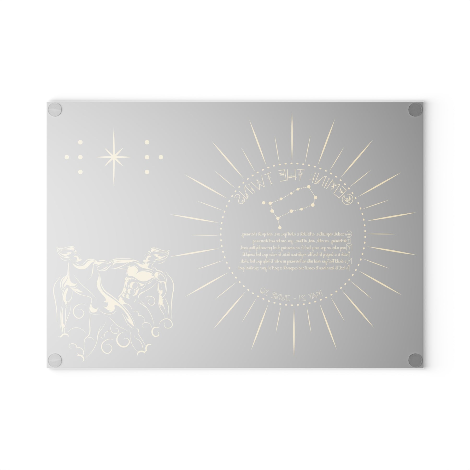Add some personality to your kitchen with a custom glass cutting board from our Written in the Stars collection. The board features a poem spelling out Gemini, accompanied by a Gemini the Twins graphic and Celestial Font. The poem embodies the spiritual goal and traits associated with your sign. Made from durable tempered glass, it stands up to years of meal prep. The textured surface is perfect for chopping, slicing, and dicing. Four rubber feet keep it steady on your counter. Choose from two sizes: 8" x 11" or 11" x 15". For best results, hand wash only.