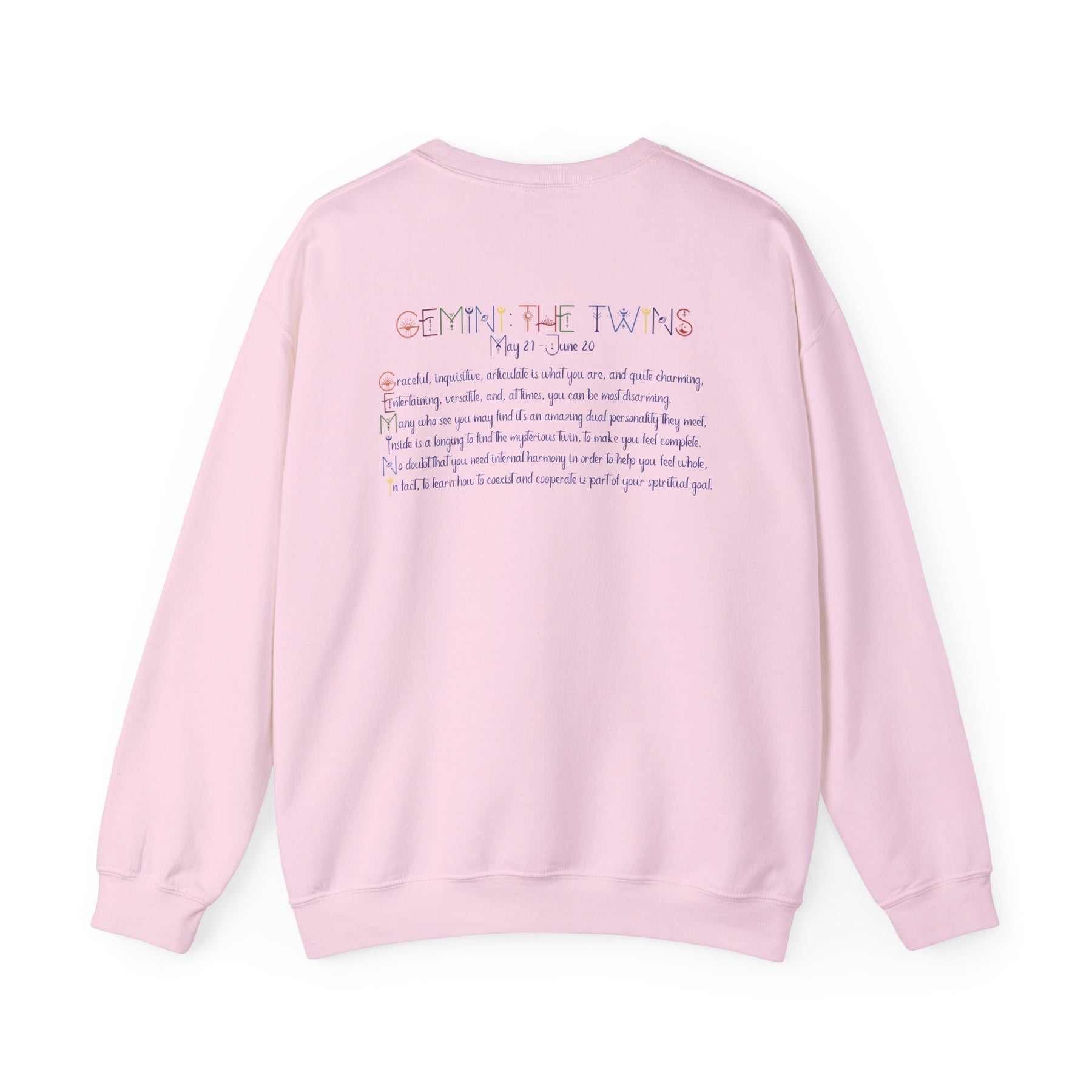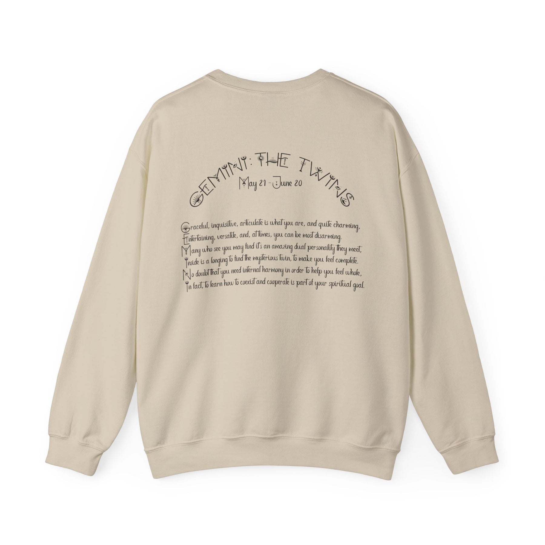 This "Written in the Stars" Gemini the Twins horoscope sign sweatshirt is a fun celebration of astrology enthusiasts. It features your horoscope sign on the front and an acrostic poem on the back based on the traits and spiritual goals of your sign. Express your sign pride with this design, perfect for casual outings and lounging at home. This sweatshirt offers comfort, durability, and a touch of astrological magic to your daily routine. It's the perfect wardrobe staple, and it is a great conversation starter for those interested in astrology. Check out the amazing Celestial font!