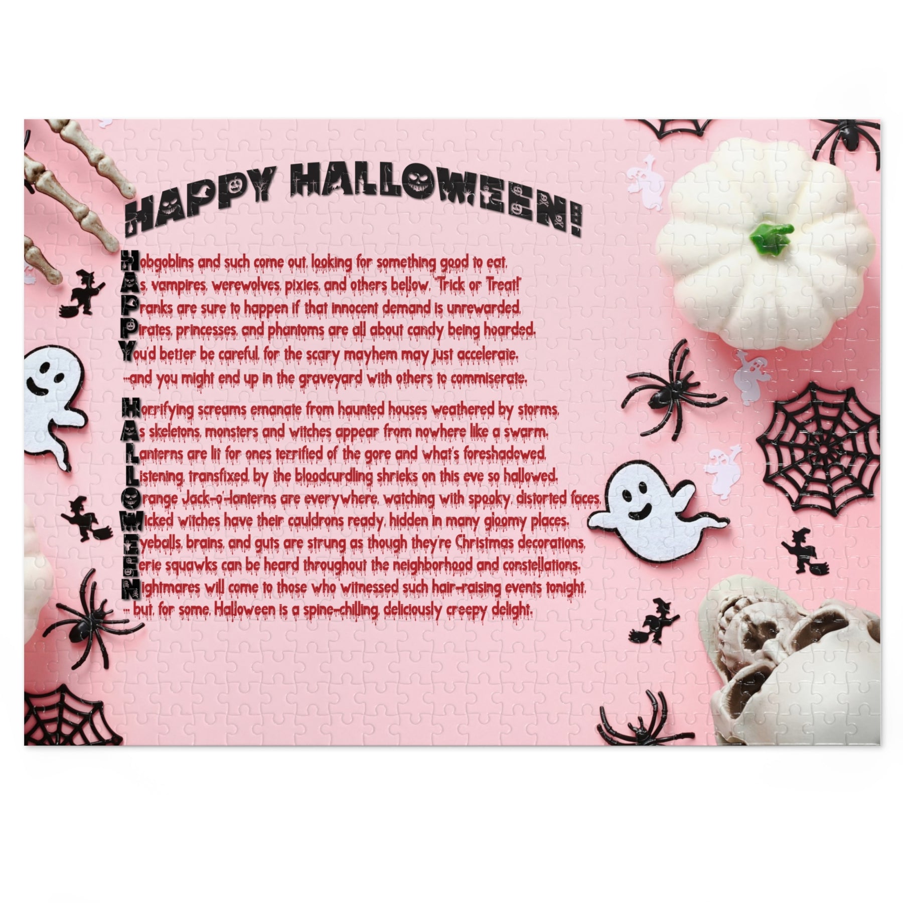 Moments in Rhyme introduces our It's Just a Phrase Happy Halloween Puzzle, meticulously crafted for Halloween enthusiasts and puzzle lovers alike. A fun design featuring an acrostic poem that spells out Happy Halloween. Piece together this enchanting puzzle, using each letter as a clue, to unveil a captivating and scary poem. With its vibrant imagery and intricate design, it's perfect for those seeking a mindful and immersive experience. Unleash your Halloween spirit and embrace the magic in this exquisite puzzle. Notice the title font with scary designs incorporated, featuring the main text dripping with bloody text. Boo! Made from sturdy puzzle board with a glossy finish, it comes in a gift-ready tin box that highlights the design. Several sizes are available.