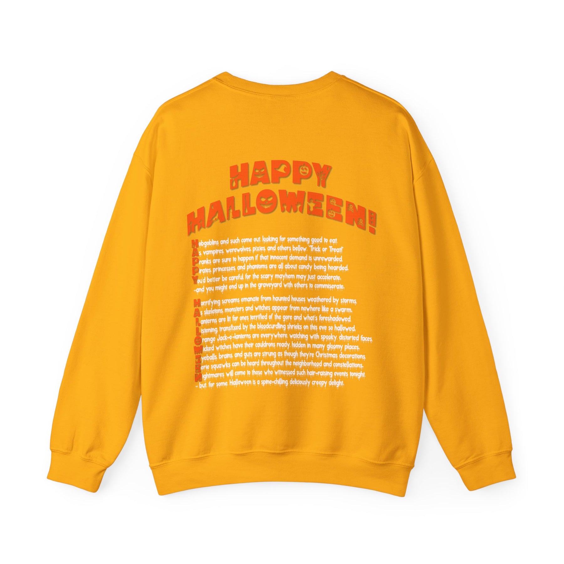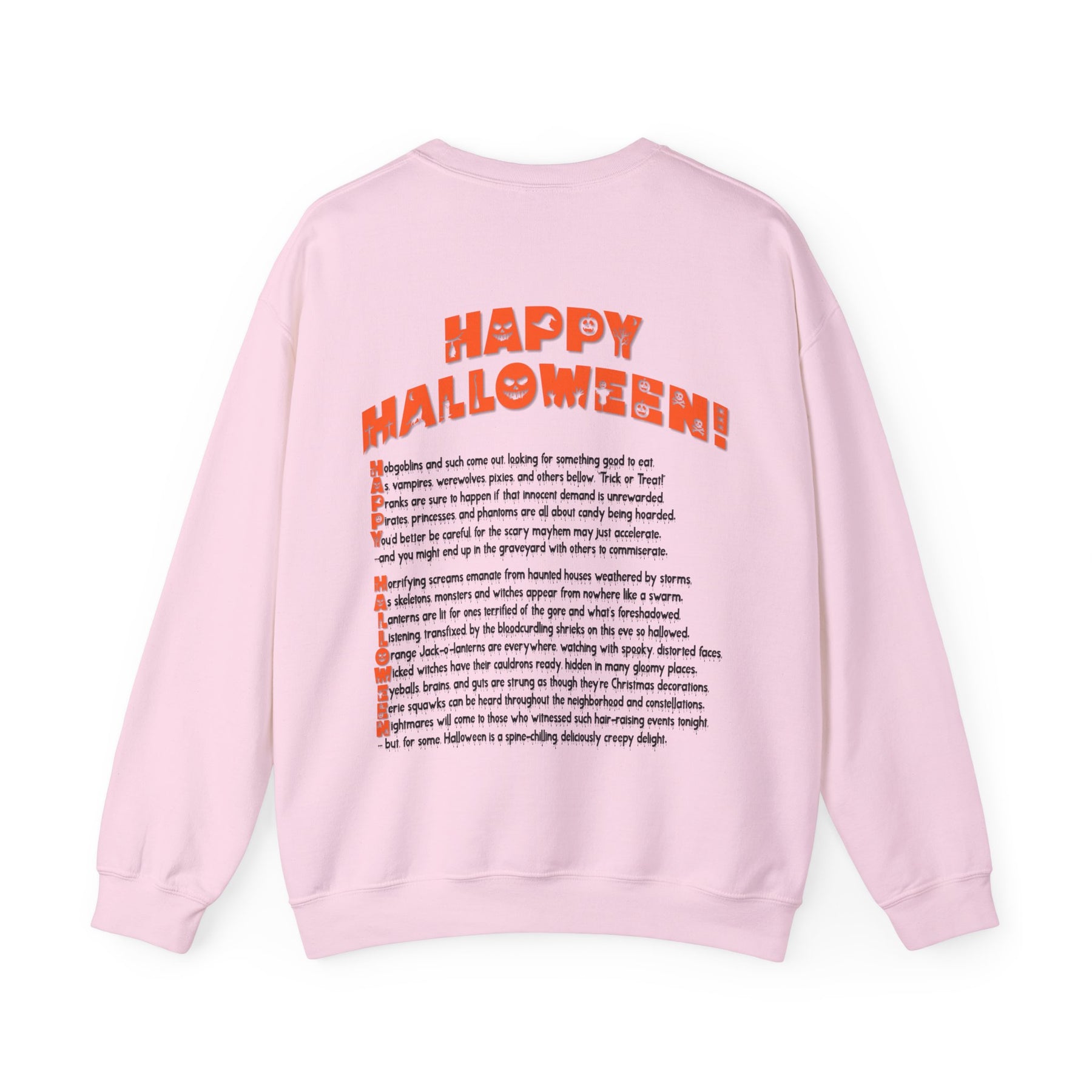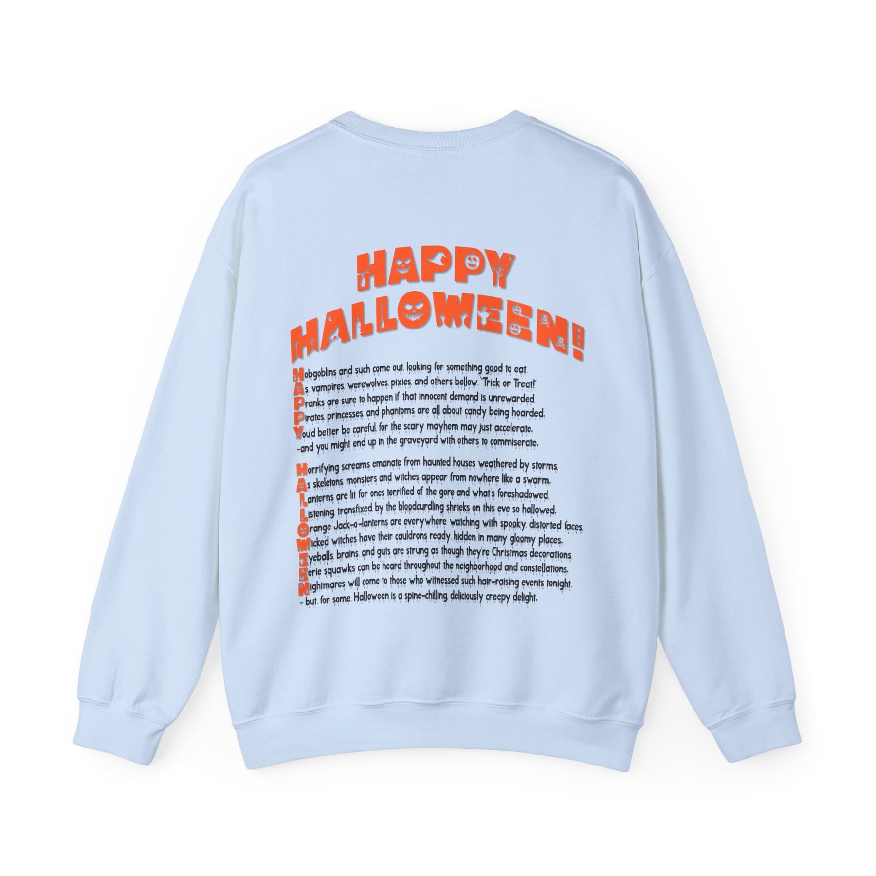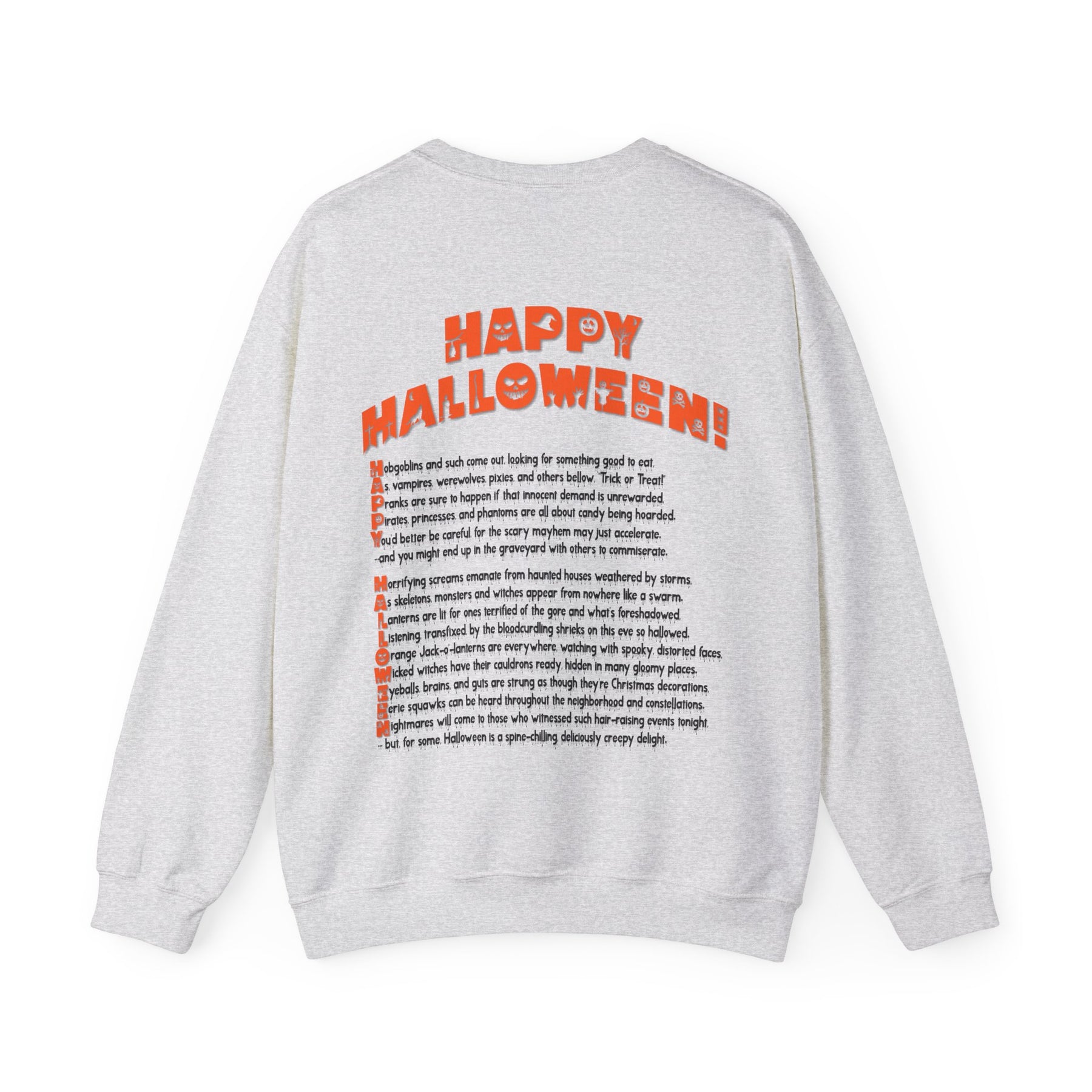 This It’s Just a Phrase acrostic poem sweatshirt features a creepy black pumpkin on the front, with an acrostic poem that spells out Happy Halloween on the back. The unique font and poem will undoubtedly spark a conversation! This sweatshirt is comfortable, durable, and adds a playful touch to the Halloween season. Plus, the amazing font really stands out!