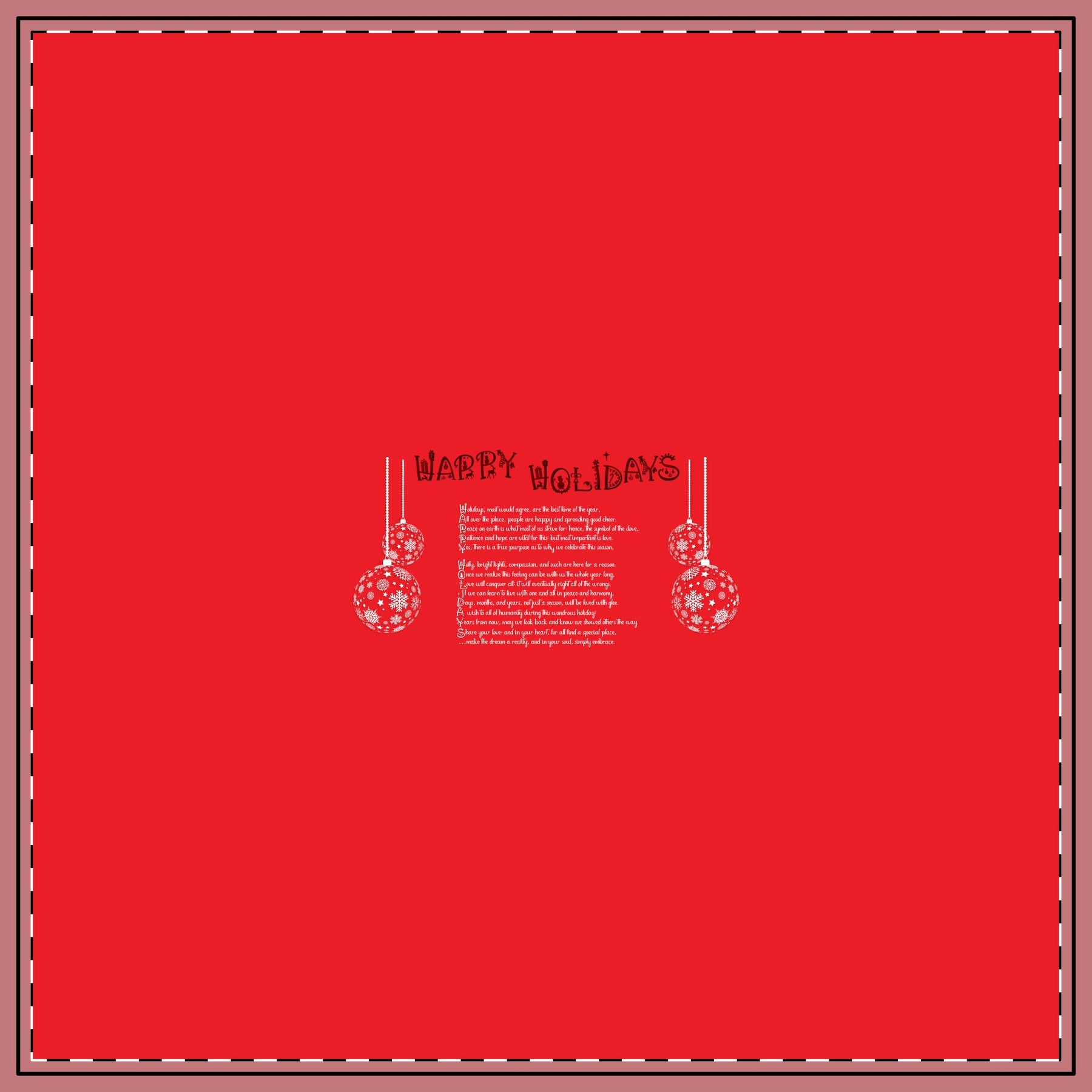 Give your dining room a festive touch with the elegant It’s Just a Phrase Winter Holidays tablecloth collection, designed to bring warmth and cheer to your home. This tablecloth features an acrostic poem that spells out Happy Holidays. Made from 100% cotton twill, it offers a smooth and durable surface perfect for family gatherings and celebrations. The simple, festive print will brighten your holiday decor and impress your guests. Available in two sizes, 58" × 58" and 58" × 102", it fits small and large tables, making it an excellent choice for any winter holiday occasion, from quiet dinners to lively parties. This tablecloth helps create a joyful, welcoming atmosphere for your celebrations. It’s ideal for families, hosts, and anyone who enjoys entertaining during the holidays. For care, machine wash gently with mild detergent, avoid bleach, and line dry.