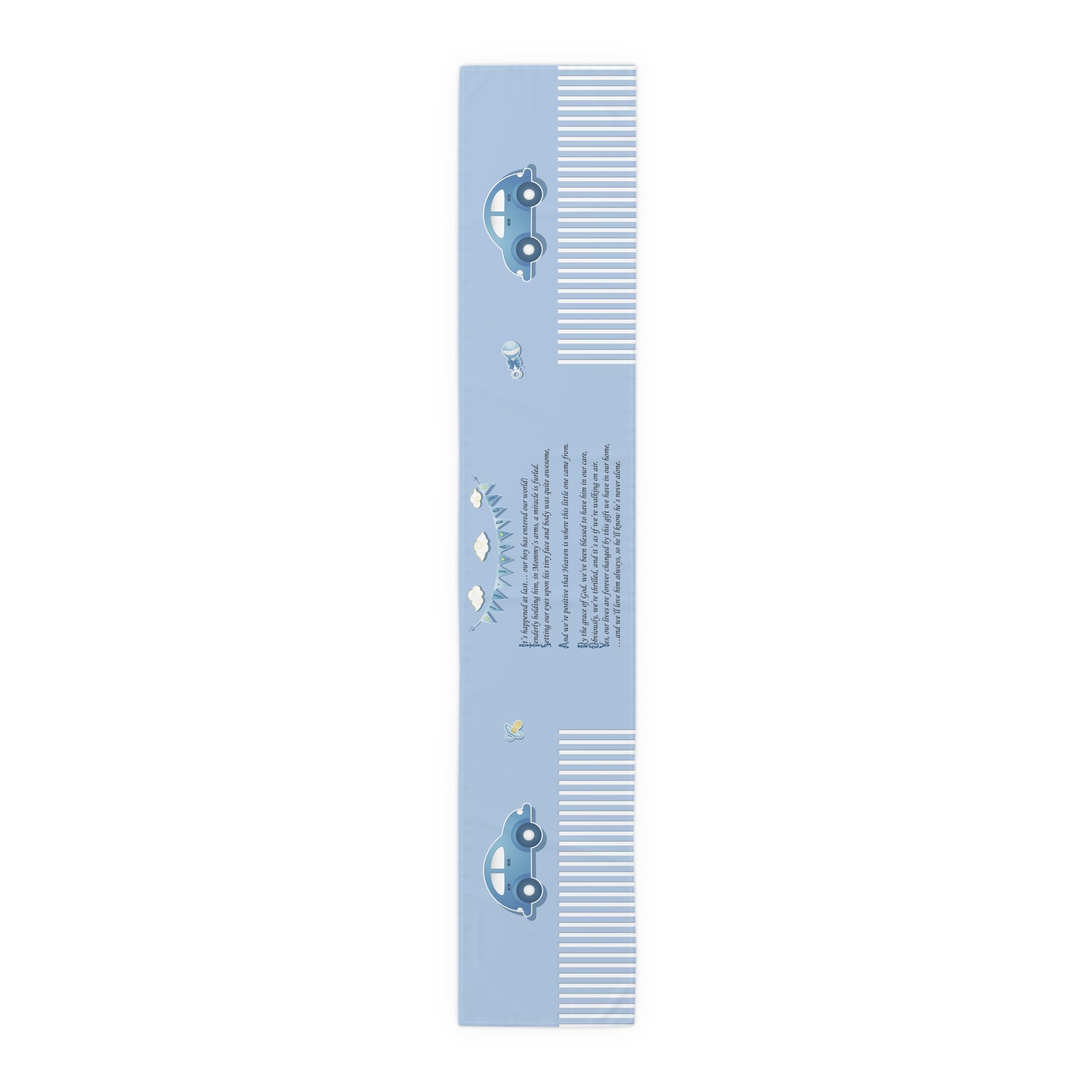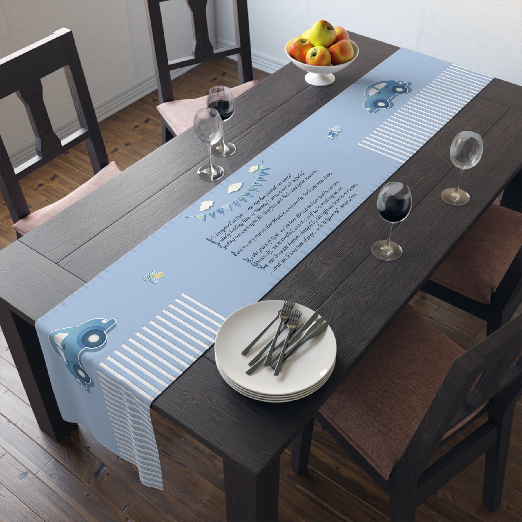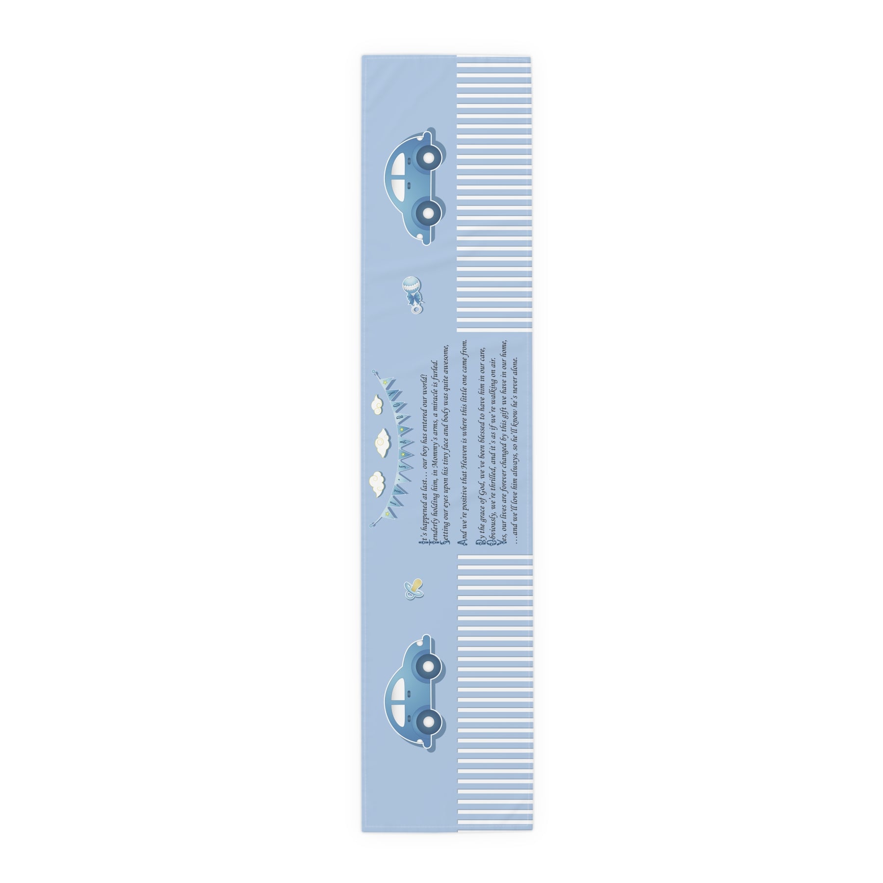 Elevate any baby shower decor with our "Baby Steps stylish table runner, with an acrostic poem spelling out "It's a Boy", and a precious design and font. It's available in either cotton twill or polyester. Perfect for adding a pop to the table setting, this runner is ideal for those looking to create a fun atmosphere at any baby shower.