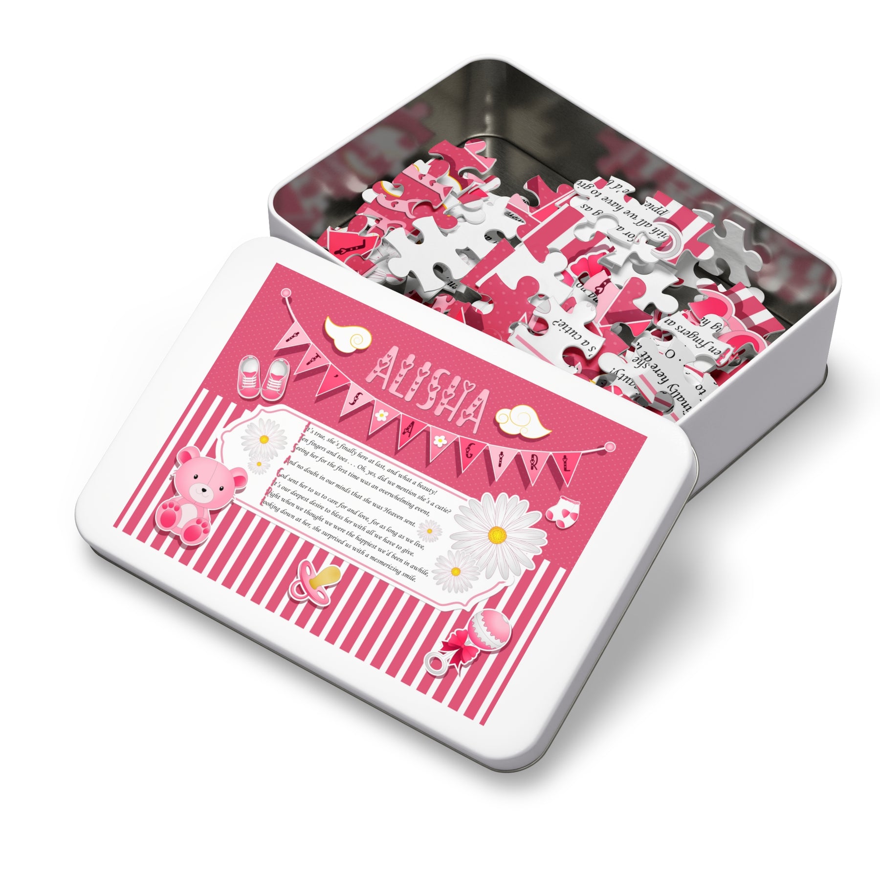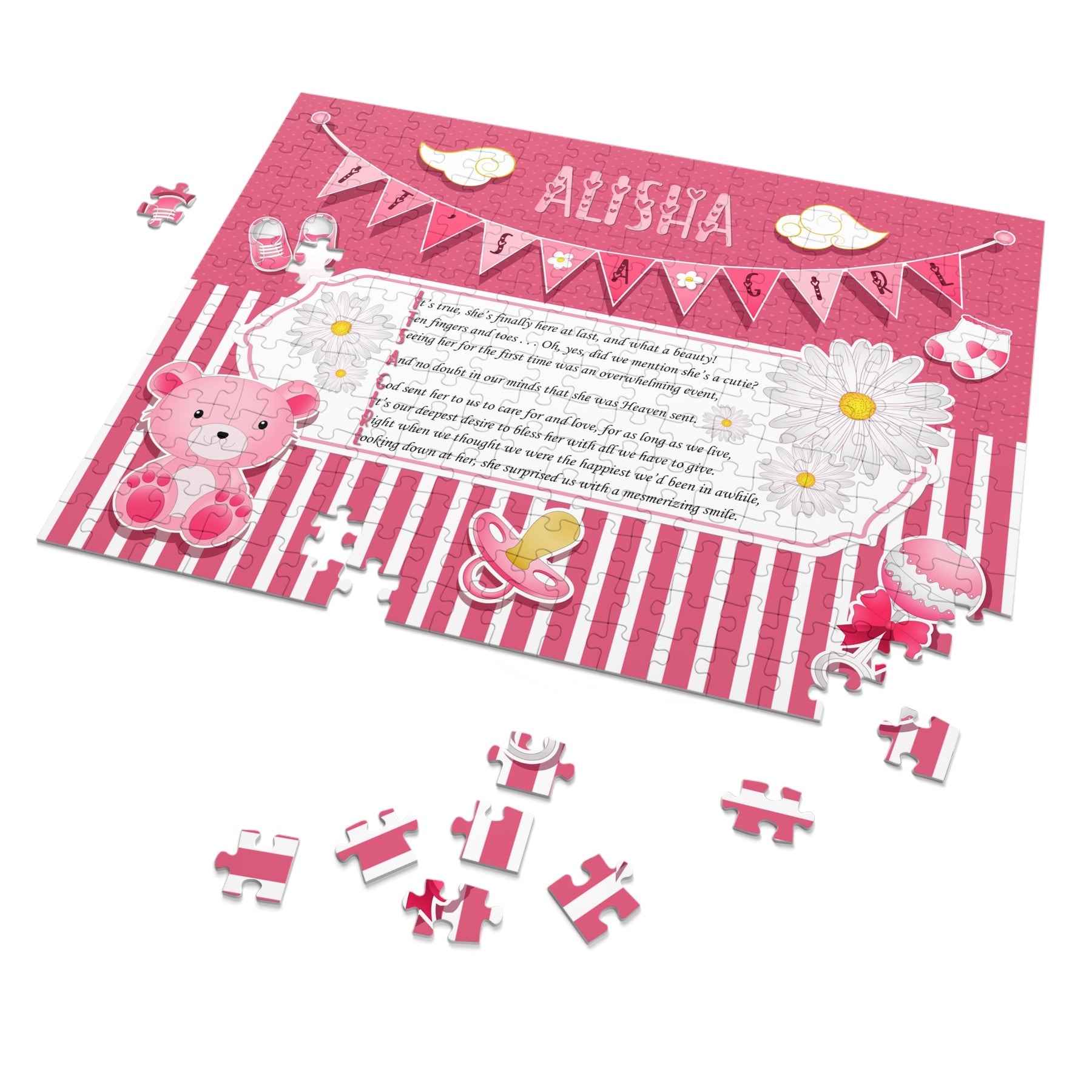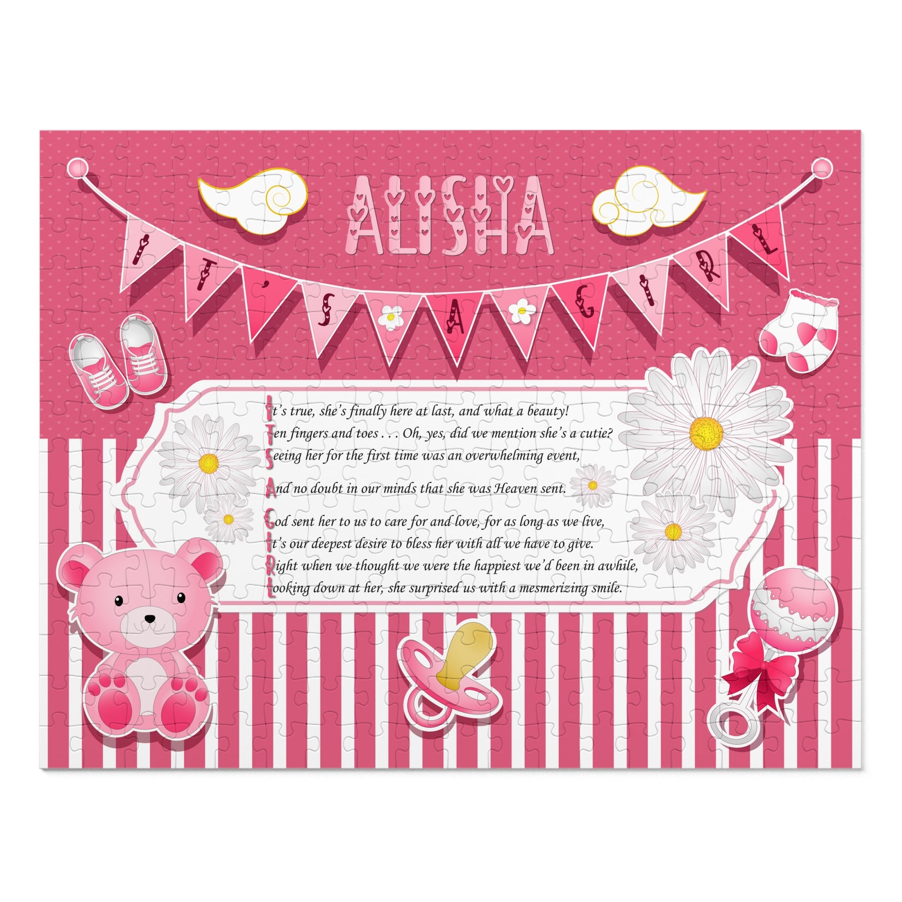 Take a look at this Baby Steps puzzle. It features an adorable design and an acrostic poem that spells out It's a Girl. It’s a fun activity for your baby shower that guests can enjoy throughout the party. They’re sure to love it, and it also makes a lovely keepsake or a gift for another new mom. The puzzle is made from sturdy board with a glossy finish and comes in a gift-ready box that highlights the design. Choose from various sizes. To personalize, add the baby's first name at checkout. A $5.00 personalization fee will be added to your cart.