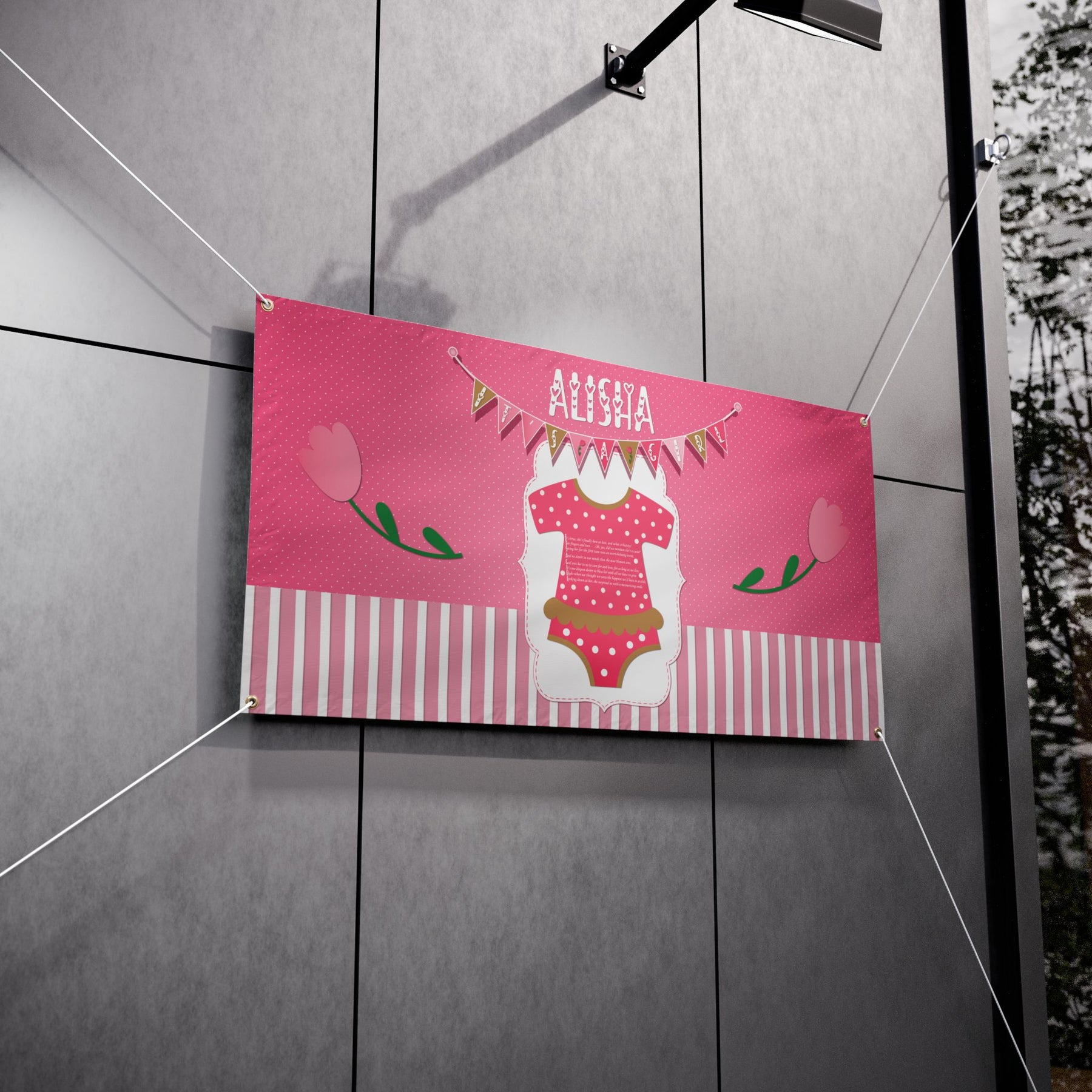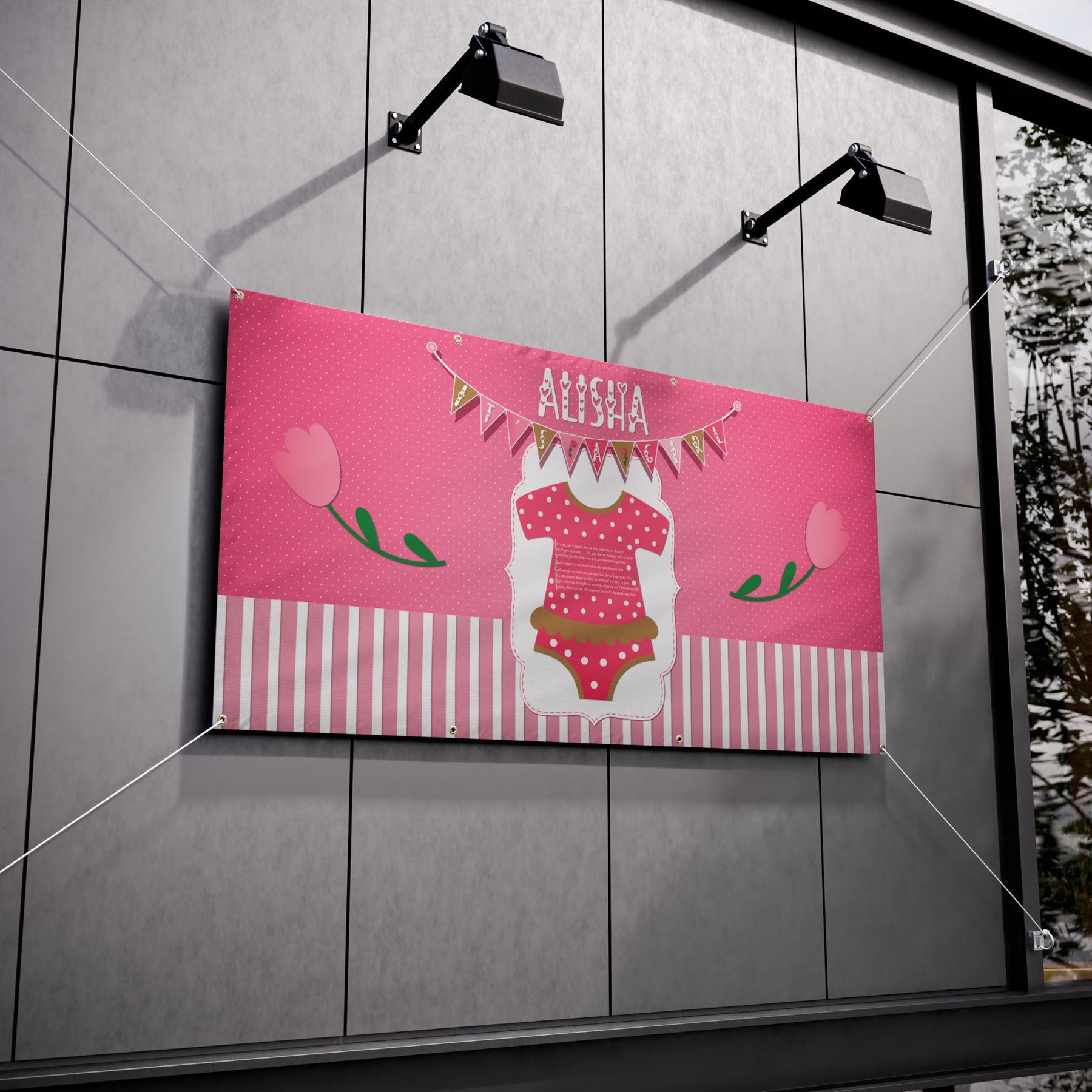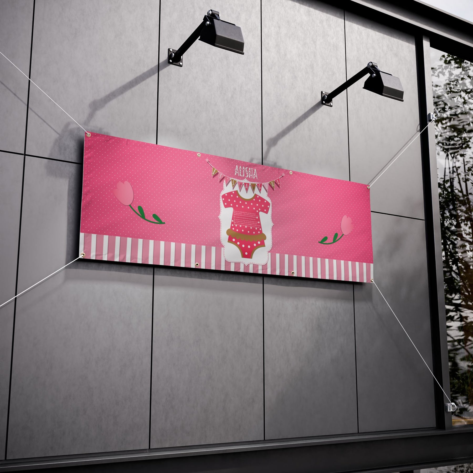 Make your baby shower memorable with our Baby Steps Vinyl Banner. This banner features an acrostic poem that spells out It’s a Girl with sweet, sentimental words and playful designs, along with the baby's first name. To personalize this banner, enter a first name upon checkout. We'll take it from there! It’s perfect for indoor and outdoor celebrations, adding a festive feel to your event. If you want to give your baby shower decor a personal touch, this banner is a wonderful choice. Made from durable material, it can handle any weather. Heat-welded hems and grommets make it easy to hang and ensure long-lasting durability. Due to its durability, it’s a great idea to pass it on to other new mothers. Use it inside or outside. To clean, wipe with a soft, damp cloth. Hanging strings are not included. Available in three sizes: 24" x 48", 24" x 72", and 36" x 72".