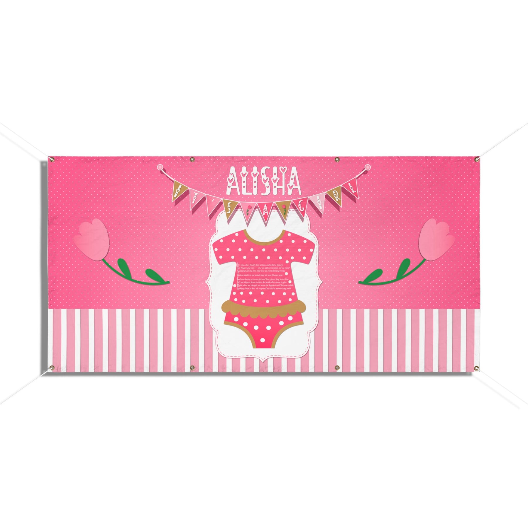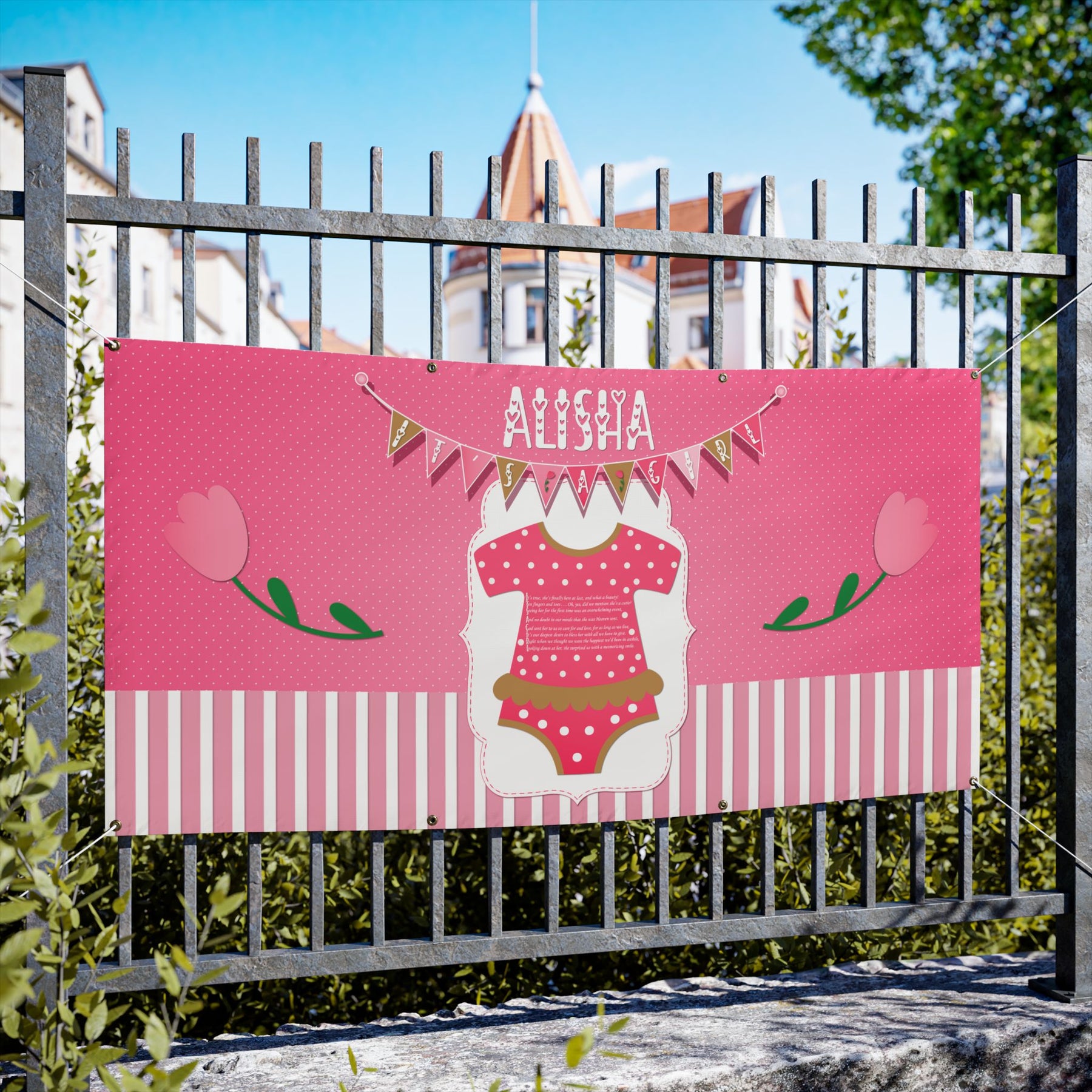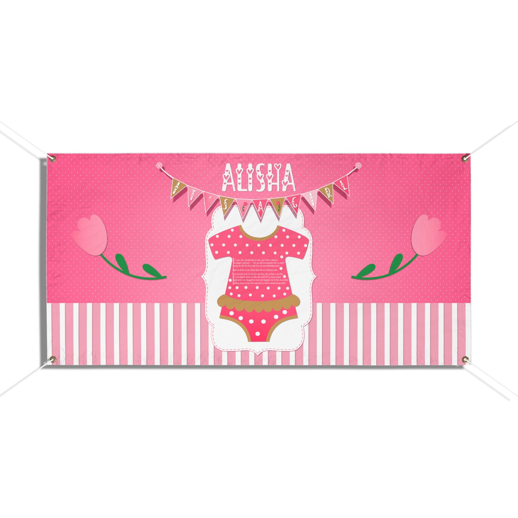 Make your baby shower memorable with our Baby Steps Vinyl Banner. This banner features an acrostic poem that spells out It’s a Girl with sweet, sentimental words and playful designs, along with the baby's first name. To personalize this banner, enter a first name upon checkout. We'll take it from there! It’s perfect for indoor and outdoor celebrations, adding a festive feel to your event. If you want to give your baby shower decor a personal touch, this banner is a wonderful choice. Made from durable material, it can handle any weather. Heat-welded hems and grommets make it easy to hang and ensure long-lasting durability. Due to its durability, it’s a great idea to pass it on to other new mothers. Use it inside or outside. To clean, wipe with a soft, damp cloth. Hanging strings are not included. Available in three sizes: 24" x 48", 24" x 72", and 36" x 72".