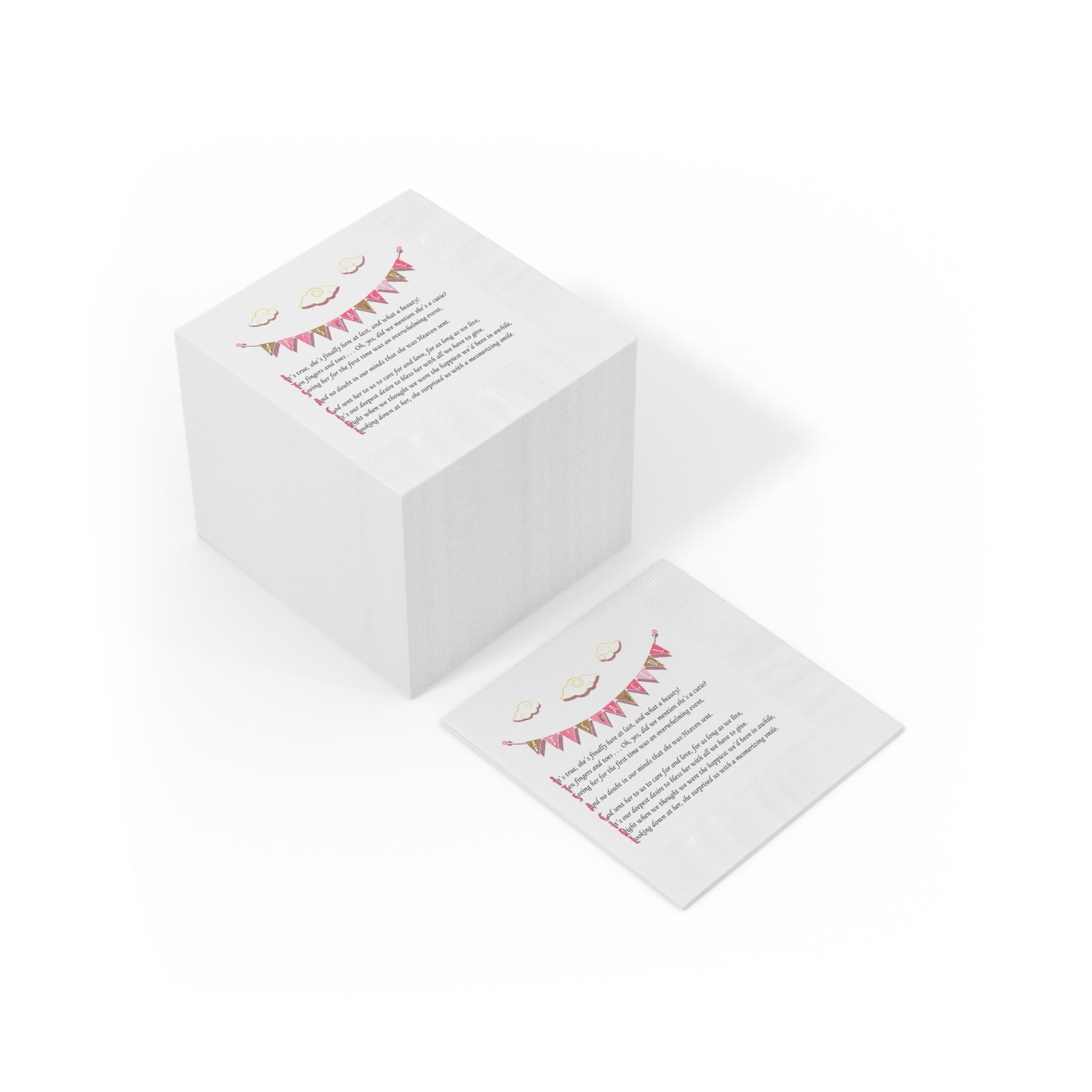 Moments in Rhyme's Baby Steps Collection announces these soft, three-ply white coined napkins spelling out "It's a Girl" with a heartfelt, sweet acrostic poem.