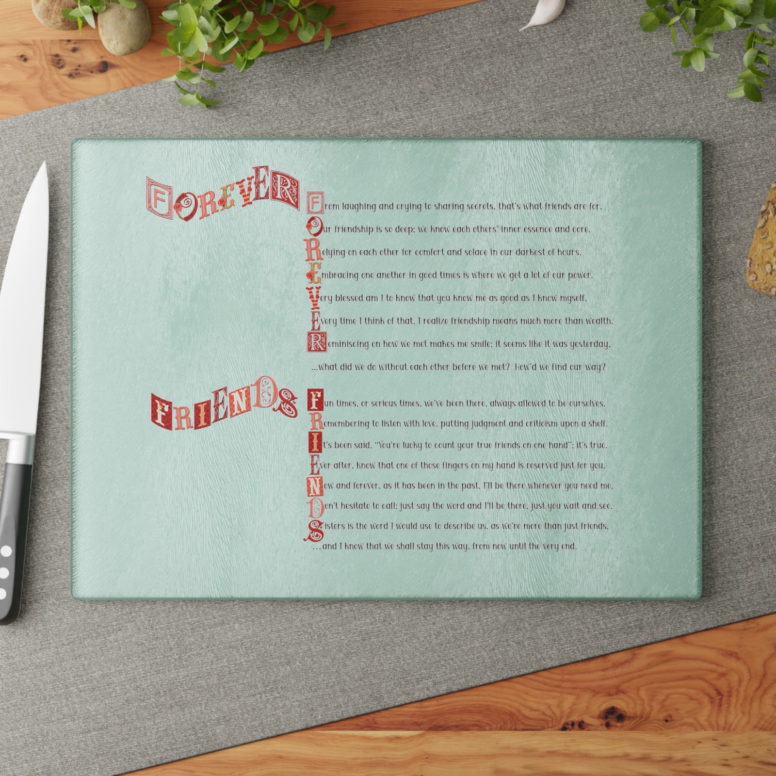 Moments in Rhyme presents our It's Just a Phrase "Forever Friends" Glass Cutting Board. In addition to celebrating friendship, this acrostic poem glass cutting board brings a touch of character into any kitchen. Its tempered glass material is robust and helps prepare many a tasty meal for a long time to come. The textured surface makes it an ideal chopping, slicing, and dicing area. Available in two sizes: 8" x 11" and 11" x 15".