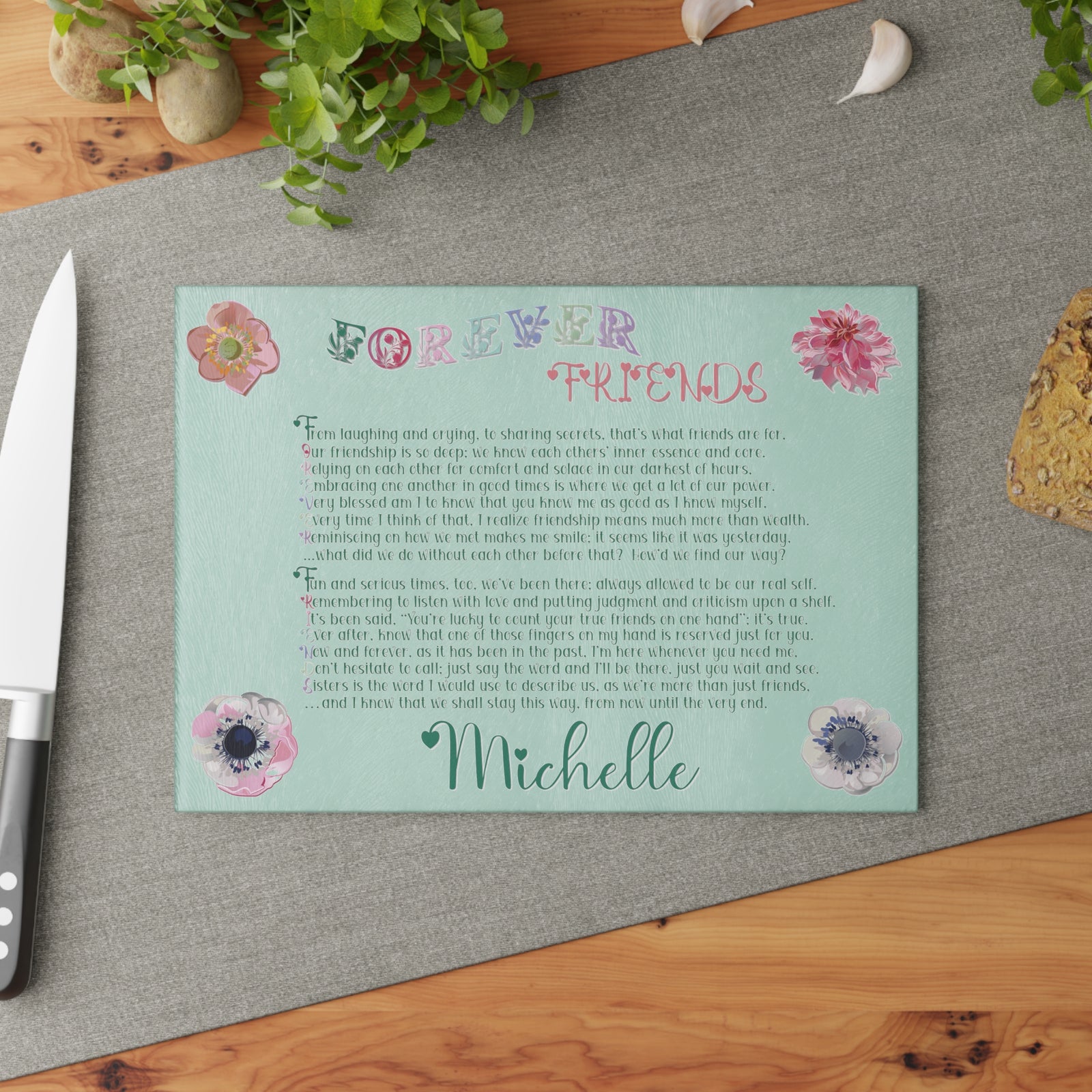 Moments in Rhyme presents our It's Just a Phrase "Forever Friends" Glass Cutting Board. In addition to celebrating friendship, this acrostic poem glass cutting board brings a touch of character into any kitchen. Its tempered glass material is robust and helps prepare many a tasty meal for a long time to come. The textured surface makes it an ideal chopping, slicing, and dicing area. Available in two sizes: 8" x 11" and 11" x 15". For a small additional fee, we'll even personalize it with a first name!