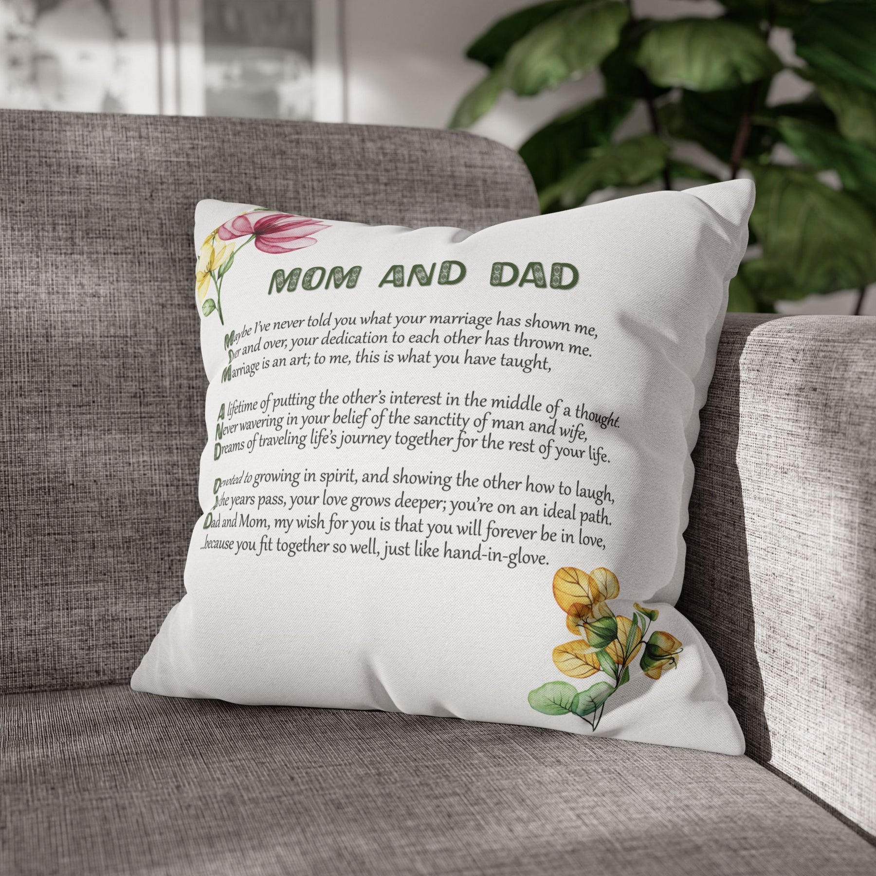 Create a personalized and heartfelt ambiance in any room with these square pillow covers from our It's Just a Phrase product line. The acrostic poem spelling out Mom and Dad adds a sentimental touch to your decor. Perfect for expressing love to your parents, this pillowcase is ideal for Mother's Day, Father's Day, birthdays, or any other special occasion to show appreciation.