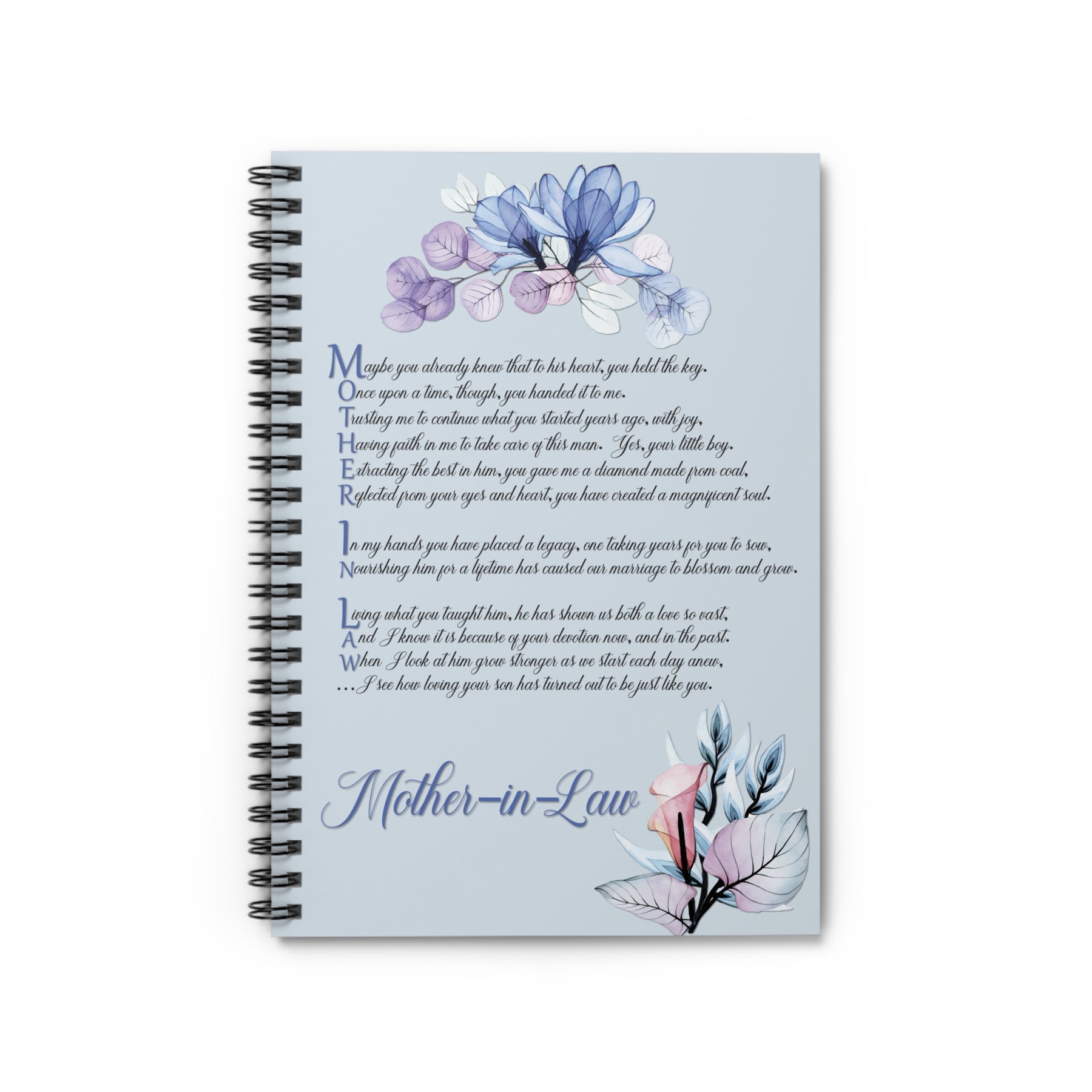 Take a look at the It's Just a Phrase Spiral Notebook Collection from Moments in Rhyme. This notebook includes an acrostic poem that spells out Mother-Law and a beautiful flower graphic. It’s a thoughtful birthday, Valentine’s, Christmas, or everyday gift to show someone you care. Use it for shopping lists, recipes, or journaling. The sturdy printed cover keeps it safe wherever you go, and the nice font helps it stand out. It comes with a dark grey back cover and 59 double-sided sheets.