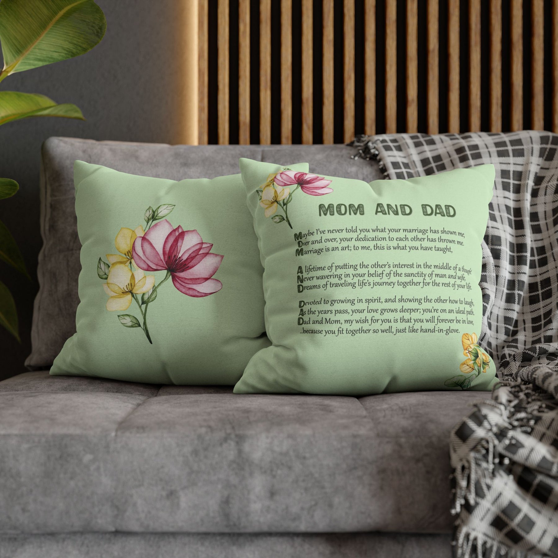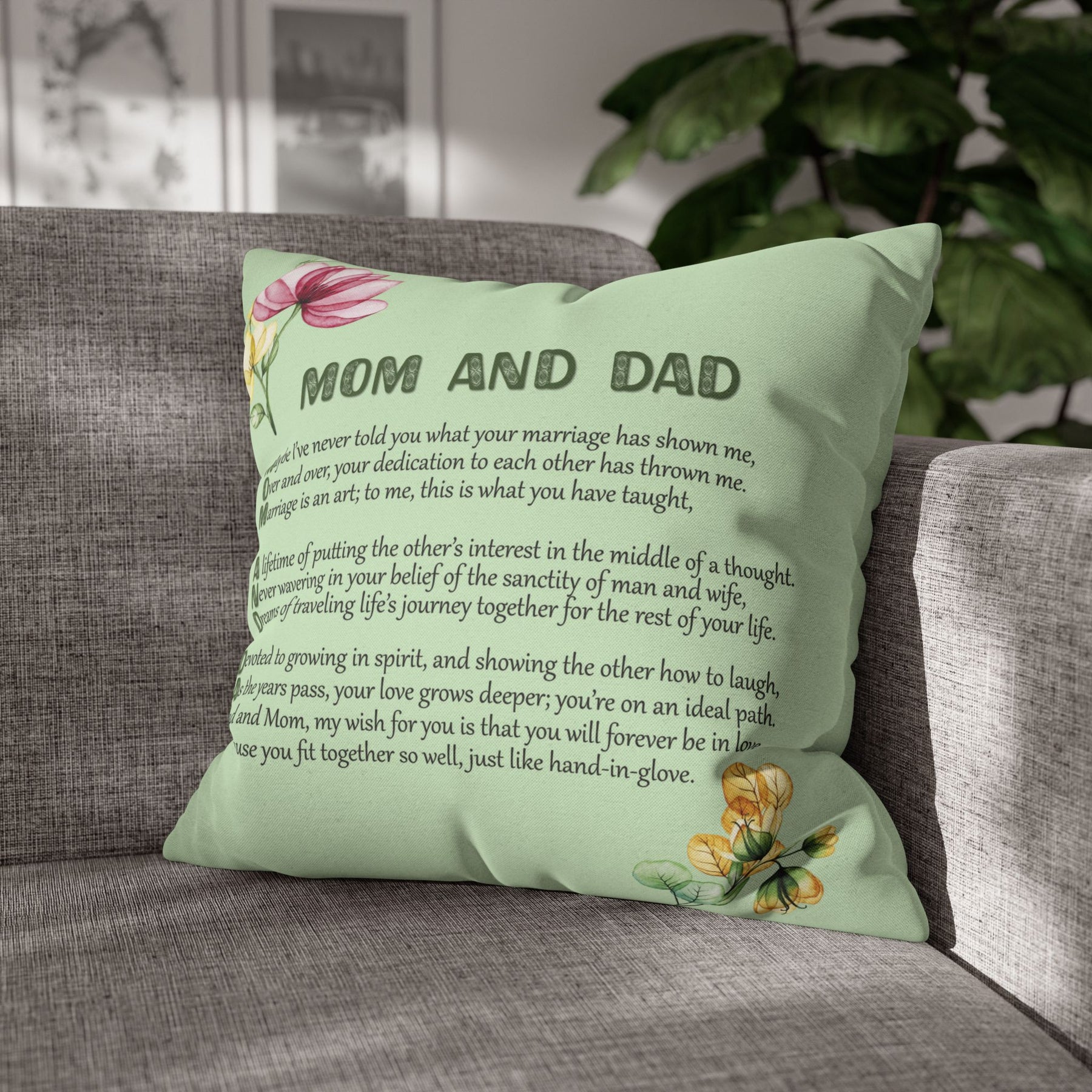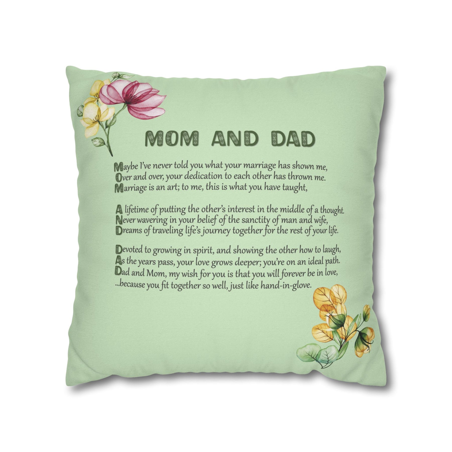 Moments in Rhyme introduces our It's Just a Phrase Pillow Collection, spelling out Mom and Dad to bring cheer to any room. Perfect for gift-giving, this will become a lifetime keepsake. Create a heartfelt ambiance in any room with these square pillow covers, and add a sentimental touch to your parents' decor. Perfect for expressing love, this pillowcase is ideal for Mother's Day, Father’s Day, birthdays, anniversaries, and Christmas, to show your appreciation. To clean, pre-treat stains with a soft cloth or bristle brush soaked in warm, soapy water. Machine wash on normal cycle. Do not bleach, tumble dry on low, do not dry-clean. Iron, steam, or dry on low heat only. Fluff to reshape.