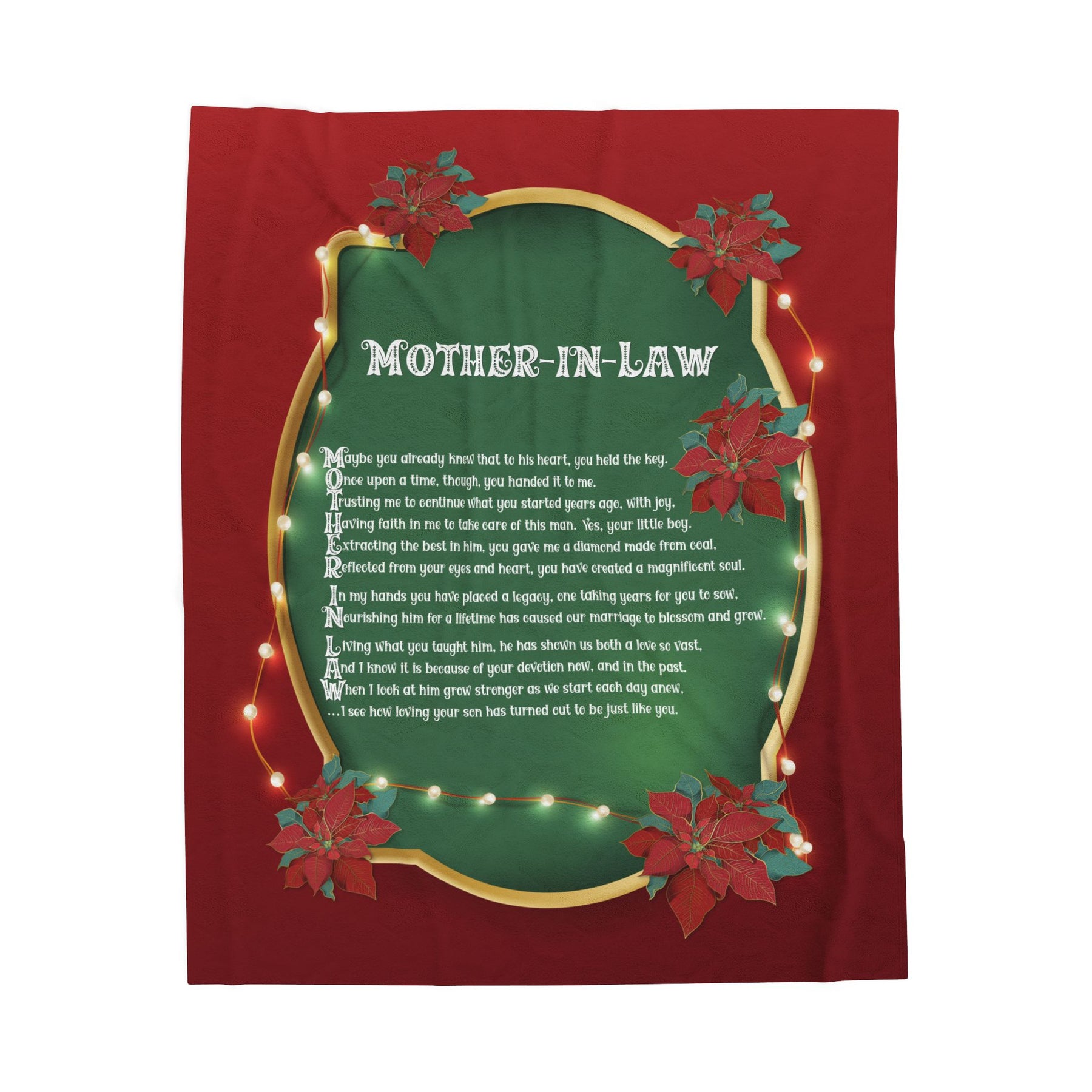 Let your precious mother-in-law experience ultimate comfort with our It’s Just a Phrase Winter Holiday Velveteen Plush Blanket, featuring an acrostic poem that spells out Mother-in-Law. This isn't just any gift for her; it's a symbol of love and appreciation. Made with the highest quality materials, this blanket is delicate, soft, and vibrant. Whether she's snuggled up indoors or enjoying outdoor events, this blanket will keep her warm and cozy. It's the perfect Christmas gift to show her how much she means to you. Don't wait, give your mother-in-law the gift of comfort for years to come! Made from 83% Polyester and 17% Spandex, a medium- to heavyweight fabric that feels exceptionally soft to the touch. Available in three sizes.