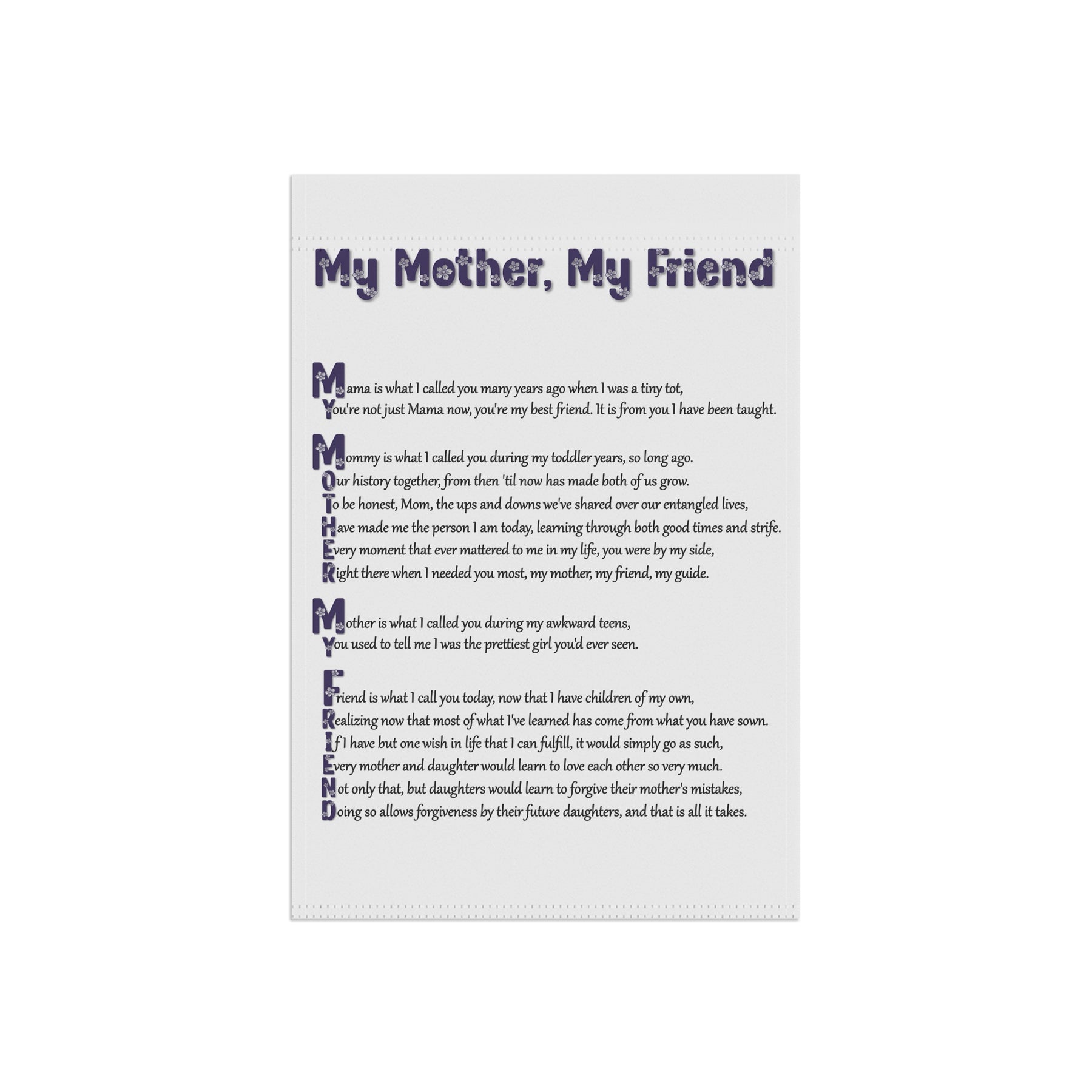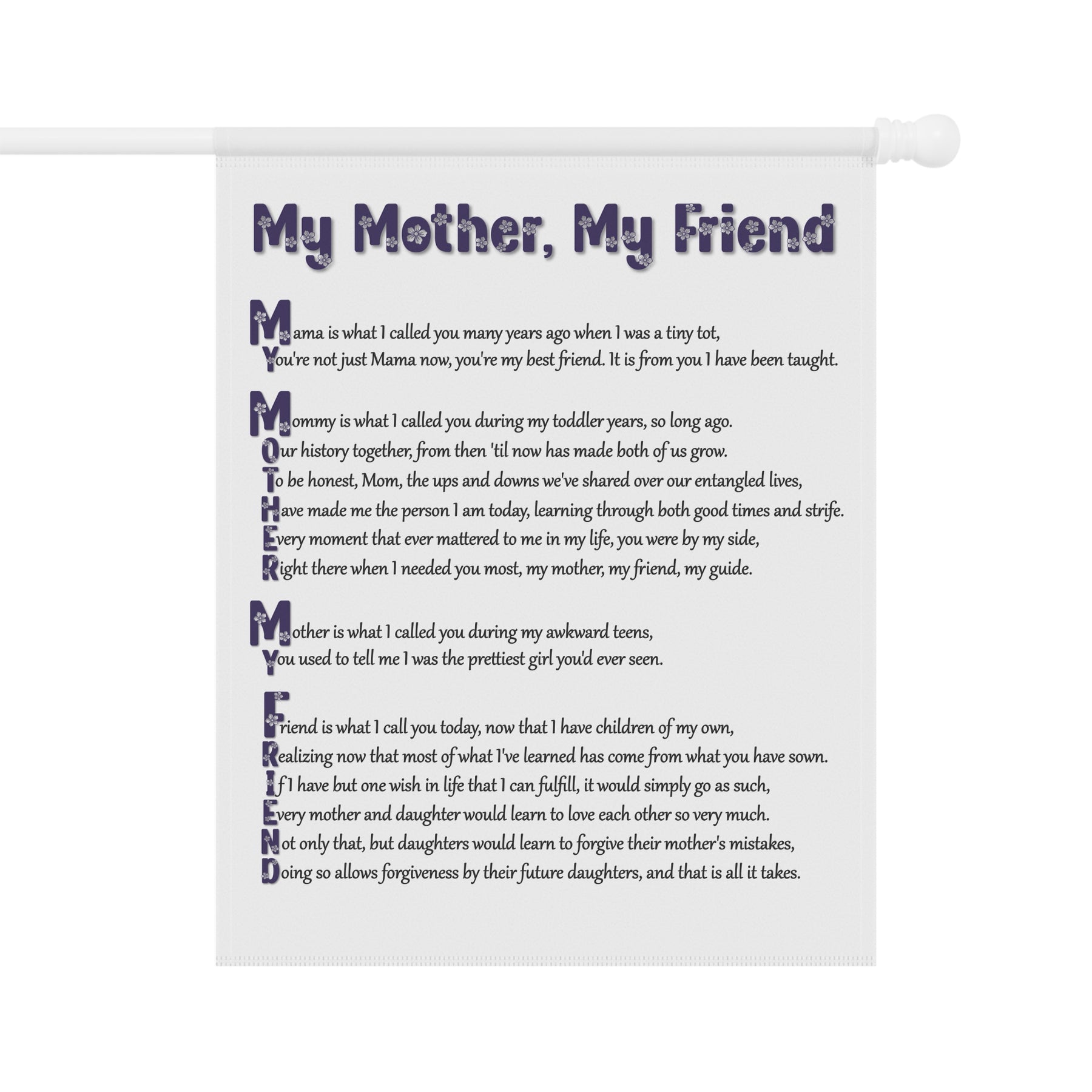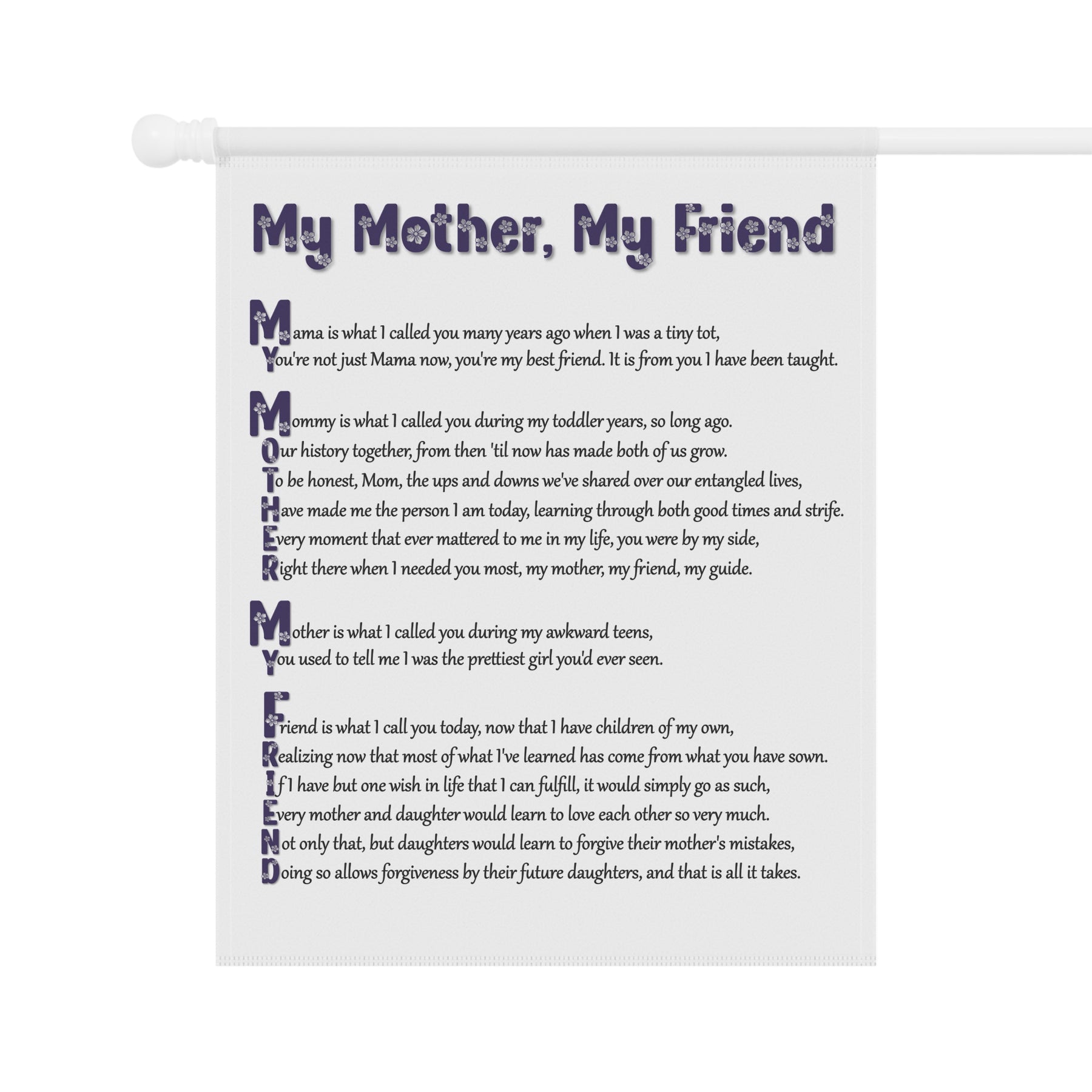 Help your mother transform her yard or garden with the simple addition of the It’s Just a Phrase Acrostic Poem banners. This garden banner spells out My Mother, My Friend with a heartfelt acrostic poem. Your mom will enjoy reading this sentimental poem year after year! The perfect gift for any friend who loves unique decor or outdoor spaces. Made with lightweight yet highly durable poly poplin-canvas fabric, these banners come in two sizes (12'' × 18'' and 24.5'' × 32'') and feature a top sleeve for easy placement on poles. Crisp detail and color appear on both sides of the flag. 100% poly poplin-canvas fabric. Features a sleeve at the top. Pole, hooks, or fasteners are not included.