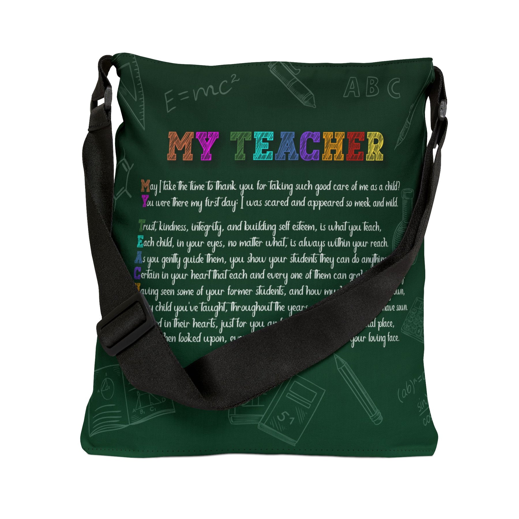 Let your child's teacher know what they've meant to you. Explore our adjustable tote bags from It's Just a Phrase. This amazing tote features an acrostic poem spelling out My Teacher with lovely prose, making it a unique choice for anyone who loves creativity. Designed for everyday use, these totes have an interior zippered pocket for added security and adjustable straps for comfort. They make great gifts for holidays, retirement parties, National Teacher Appreciation Week, or the end of the school year. Made from specially spun polyester threads, they keep their shape and resist wrinkles, so there’s no need to iron. Just spot clean or dry clean as needed. Available in two sizes. Just provide the teacher's name, and we'll handle the things from there.
