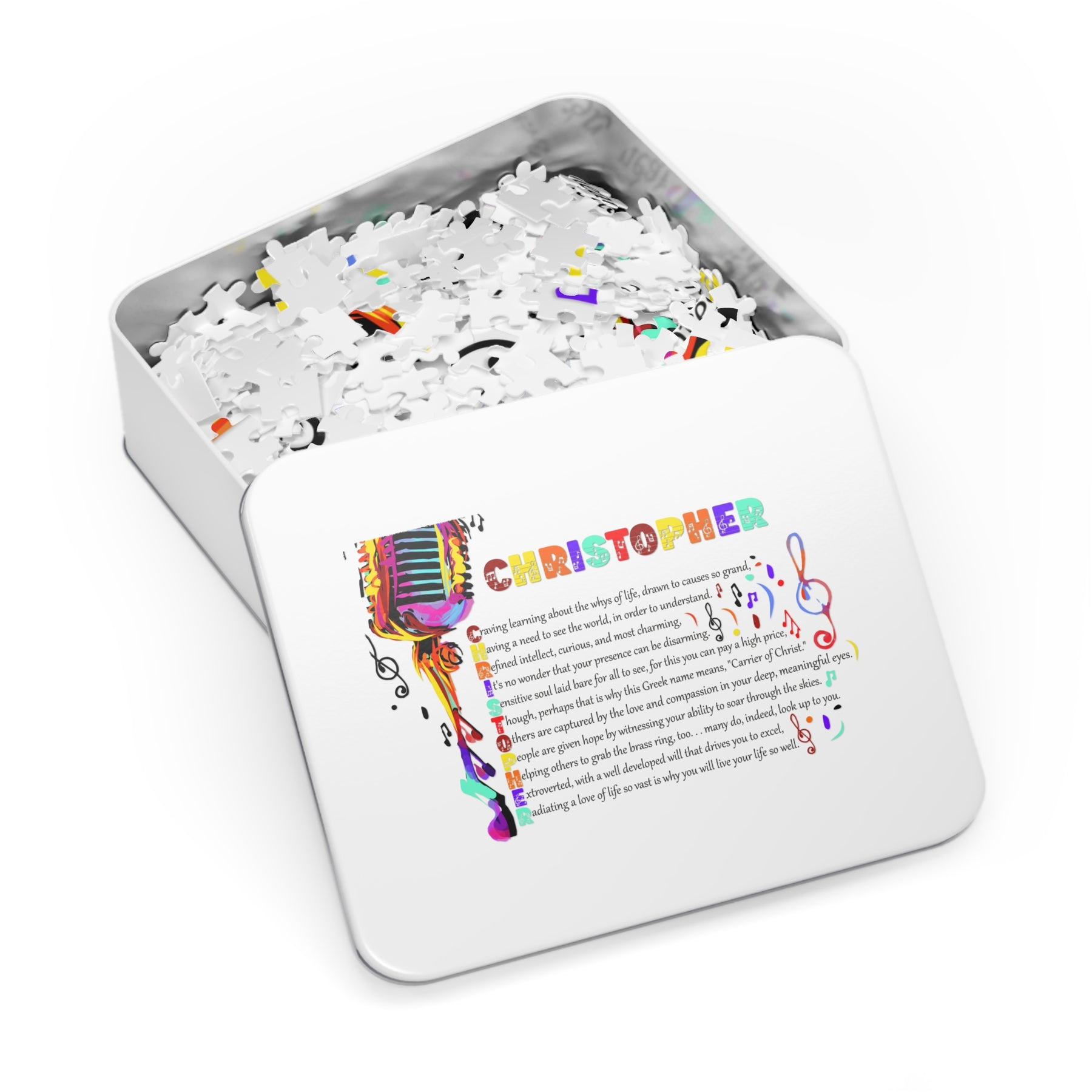 Namesakes from Moments in Rhyme creates acrostic poem puzzles that make thoughtful gifts for birthdays, holidays, Easter, or any special day. This puzzle features a musical note and microphone design, along with a fun font. The poem shares the meaning and origin of the chosen name. Carefully crafted, this keepsake is designed to be a lasting memory. Let us know the name you'd like, and we’ll take care of the rest. The puzzle is built from sturdy puzzle board with a glossy finish and comes in a tin box ready for gifting. The design may change slightly based on the number of letters in the name.