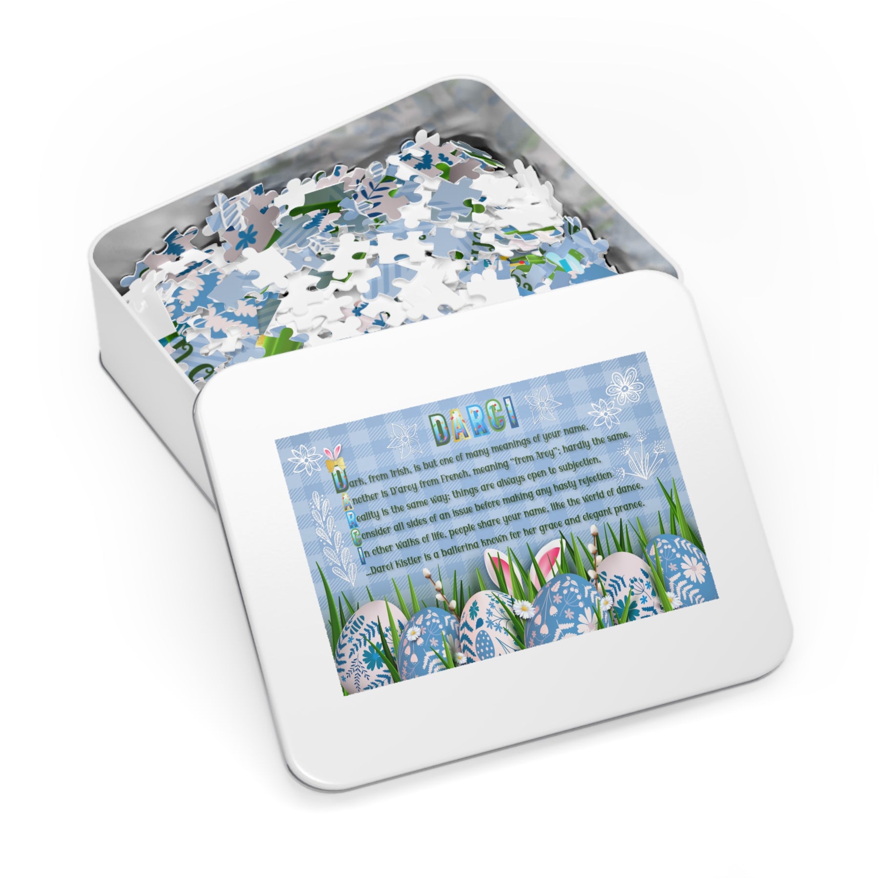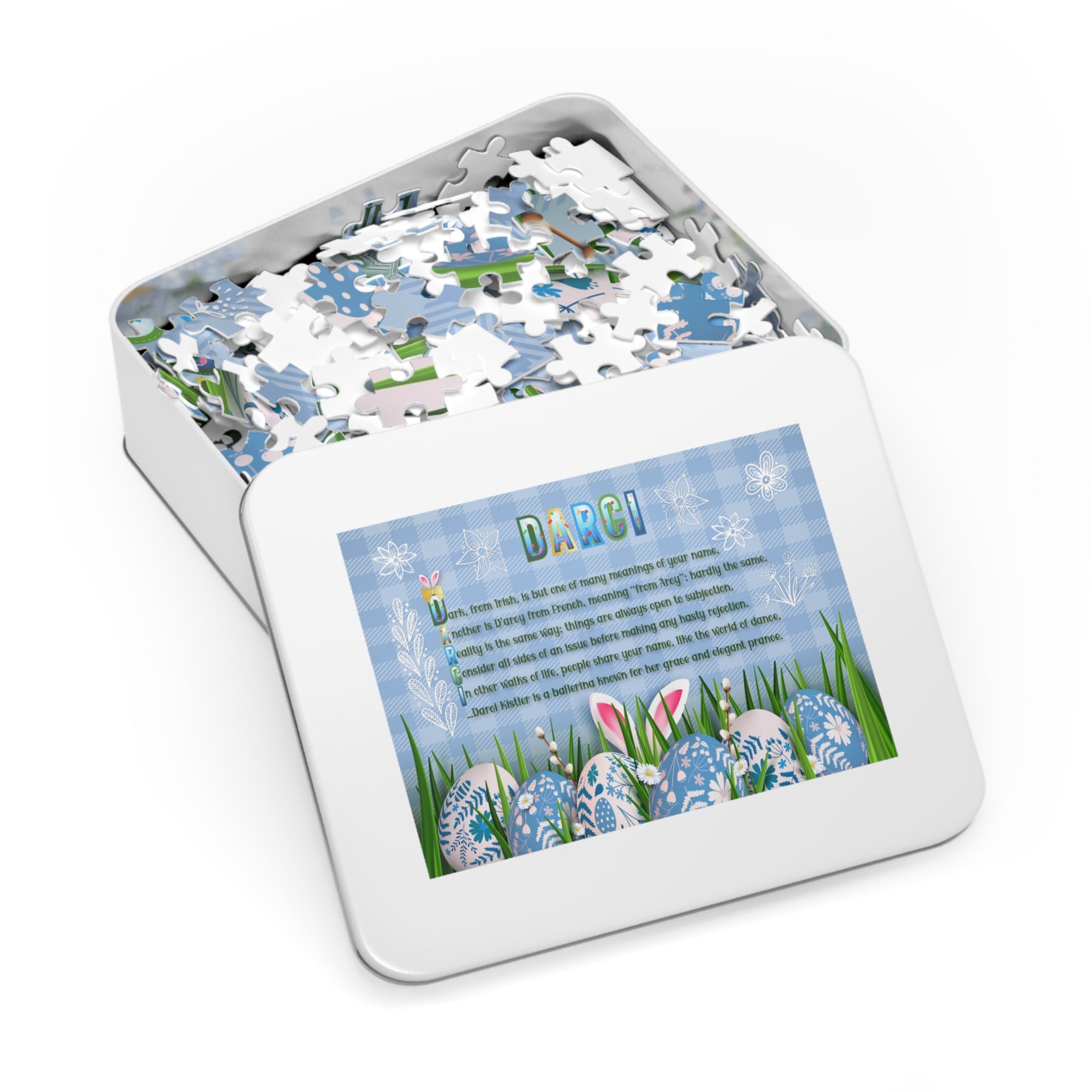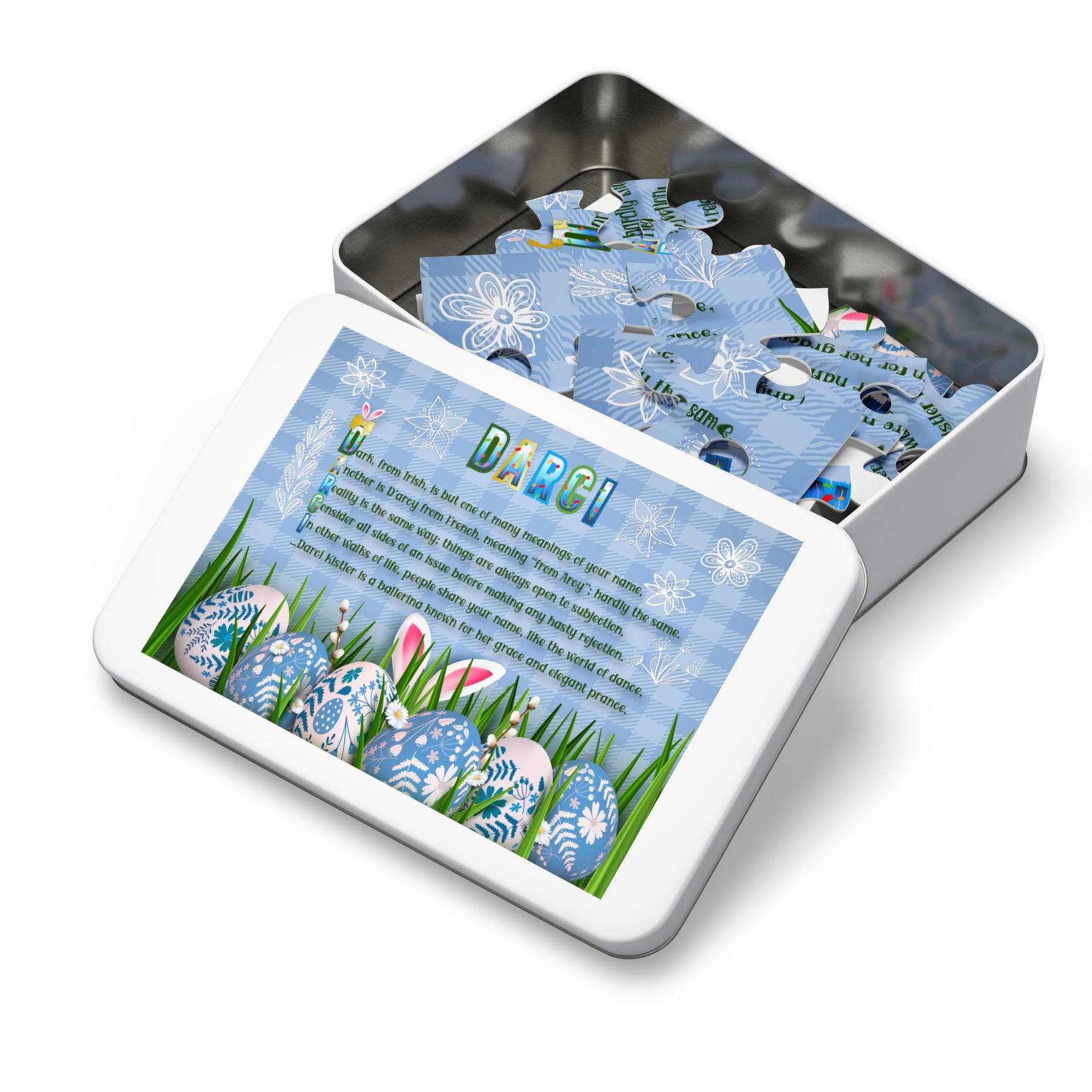 Namesakes from Moments in Rhyme creates acrostic poem puzzles that make thoughtful gifts for birthdays, holidays, Easter, or any special day. This puzzle has a comic-style look and a fun font. The poem shares the meaning and origin of the chosen name. Carefully crafted, this keepsake is designed to be a lasting memory. Let us know the name you'd like, and we’ll take care of the rest. The puzzle is built from sturdy puzzle board with a glossy finish and comes in a tin box ready for gifting. The design may change slightly based on the number of letters in the name.