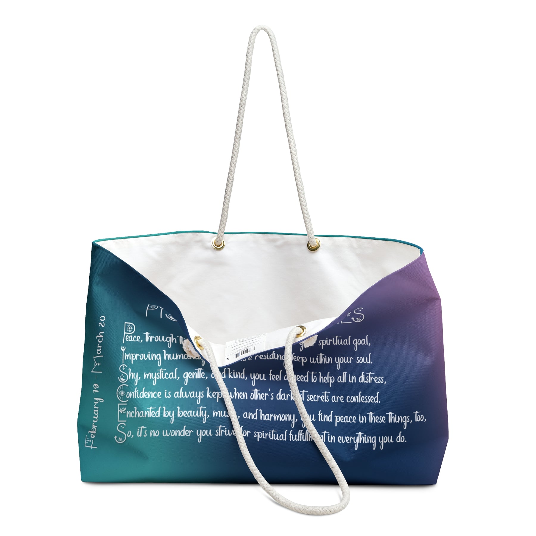 Take your essentials with you in style with our Written in the Stars Weekender Bag Collection. Each roomy tote features an acrostic poem that spells out Pisces. This bag is more than just practical—it makes a statement and celebrates both words and astrology. It’s great for weekends, the gym, or daily use, especially if you love literary art and all things cosmic. It also makes thoughtful gifts for bridesmaids, birthdays, holidays, or just for yourself. With lots of space for your things, this bag is sure to become a favorite. Give someone special a gift they can use for years. One size: 24" x13"