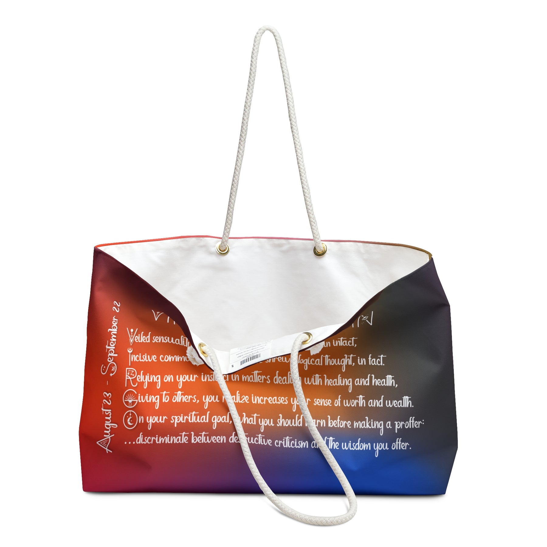 Take your essentials with you in style with our Written in the Stars Weekender Bag Collection. Each roomy tote features an acrostic poem that spells out Virgo. This bag is more than just practical—it makes a statement and celebrates both words and astrology. It’s great for weekends, the gym, or daily use, especially if you love literary art and all things cosmic. It also makes thoughtful gifts for bridesmaids, birthdays, holidays, or just for yourself. With lots of space for your things, this bag is sure to become a favorite. Give someone special a gift they can use for years. One size: 24" x13"