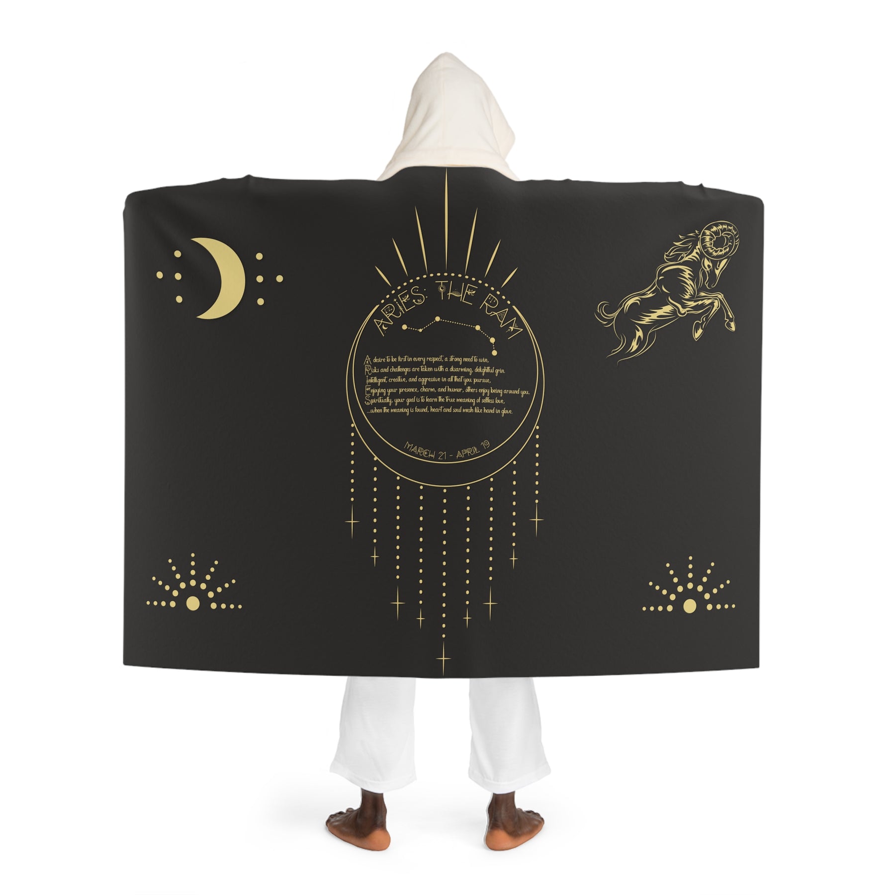 Wrap yourself in comfort and style with the Written in the Stars horoscope sign hooded sherpa blanket. This one features an acrostic poem that spells out Aries, highlighting the sign's traits and spiritual goals. The unique Celestial font adds a fun detail. This hooded blanket is a thoughtful gift for any occasion and is sure to become a favorite. Made from high-quality, soft, and vibrant materials, it keeps you warm whether you're relaxing at home or spending time outside. The plush fleece is extra soft, and the cream-colored Sherpa hood gives it a special touch. For care, machine wash in cold water and tumble dry on a low setting. Do not iron, bleach, or dry-clean. One size: 70.5" x 52".