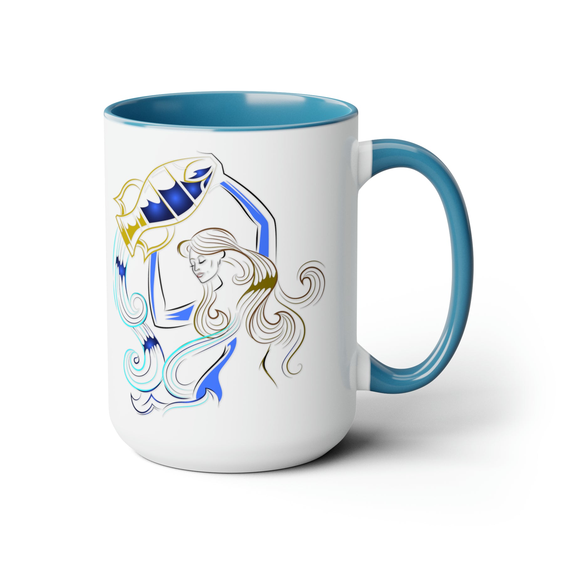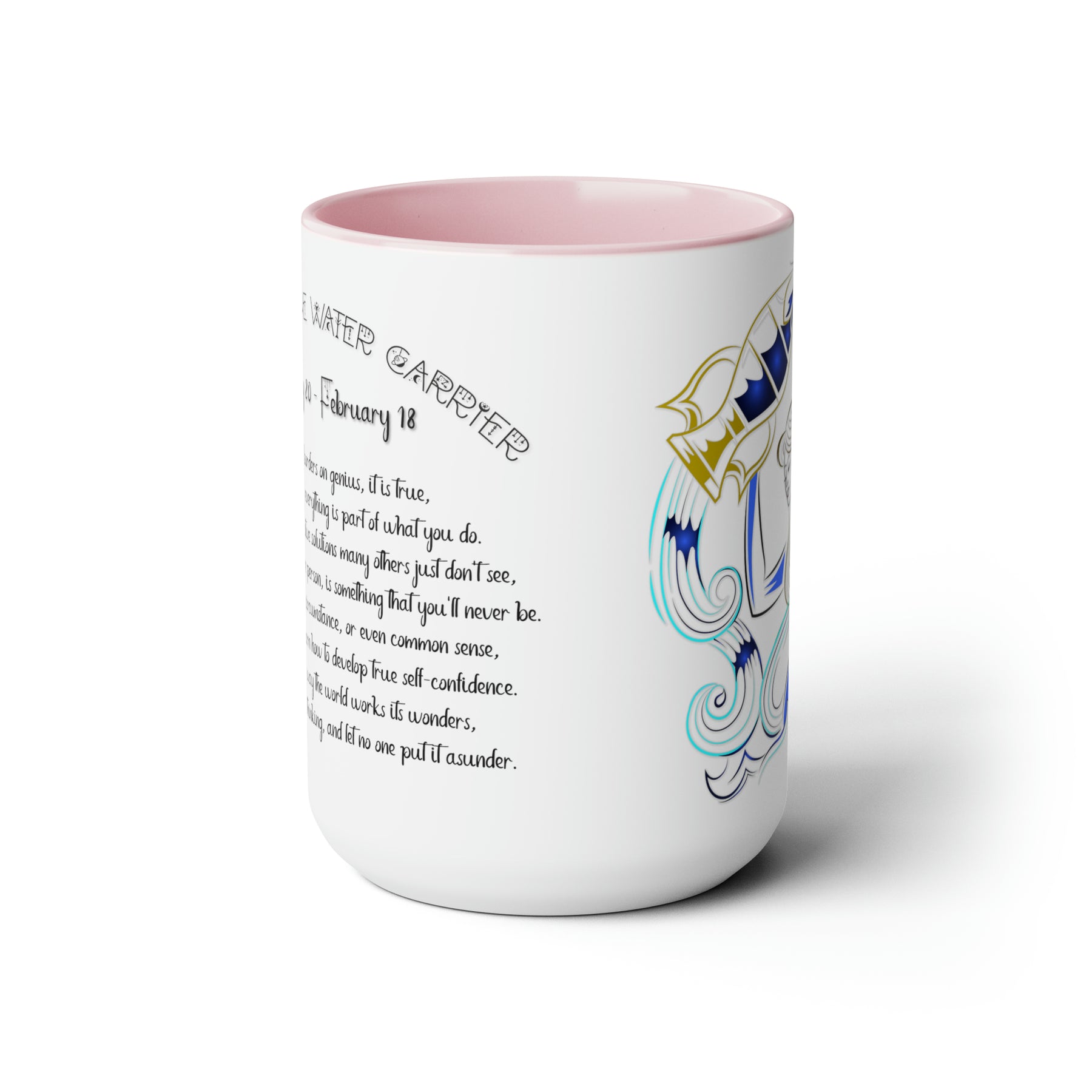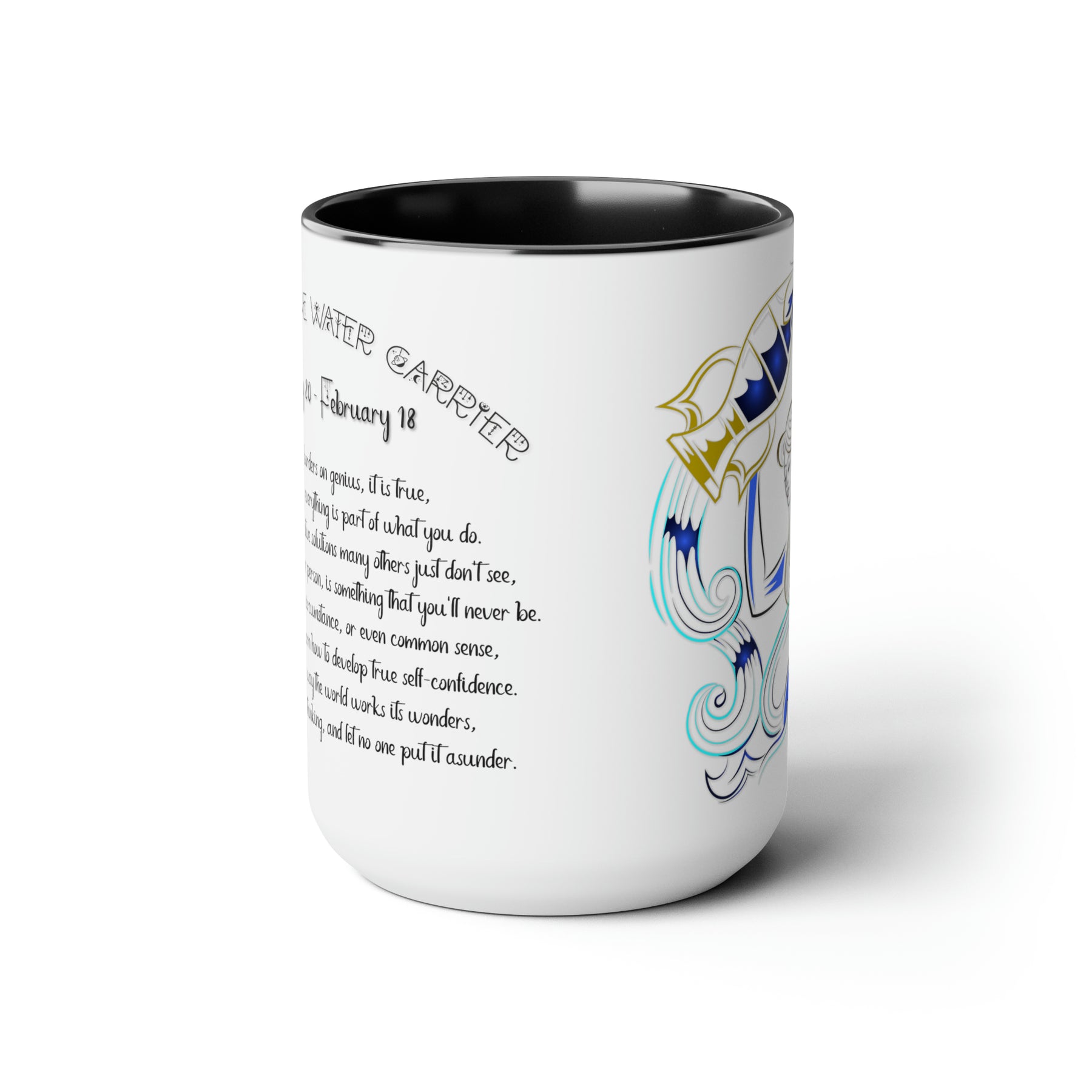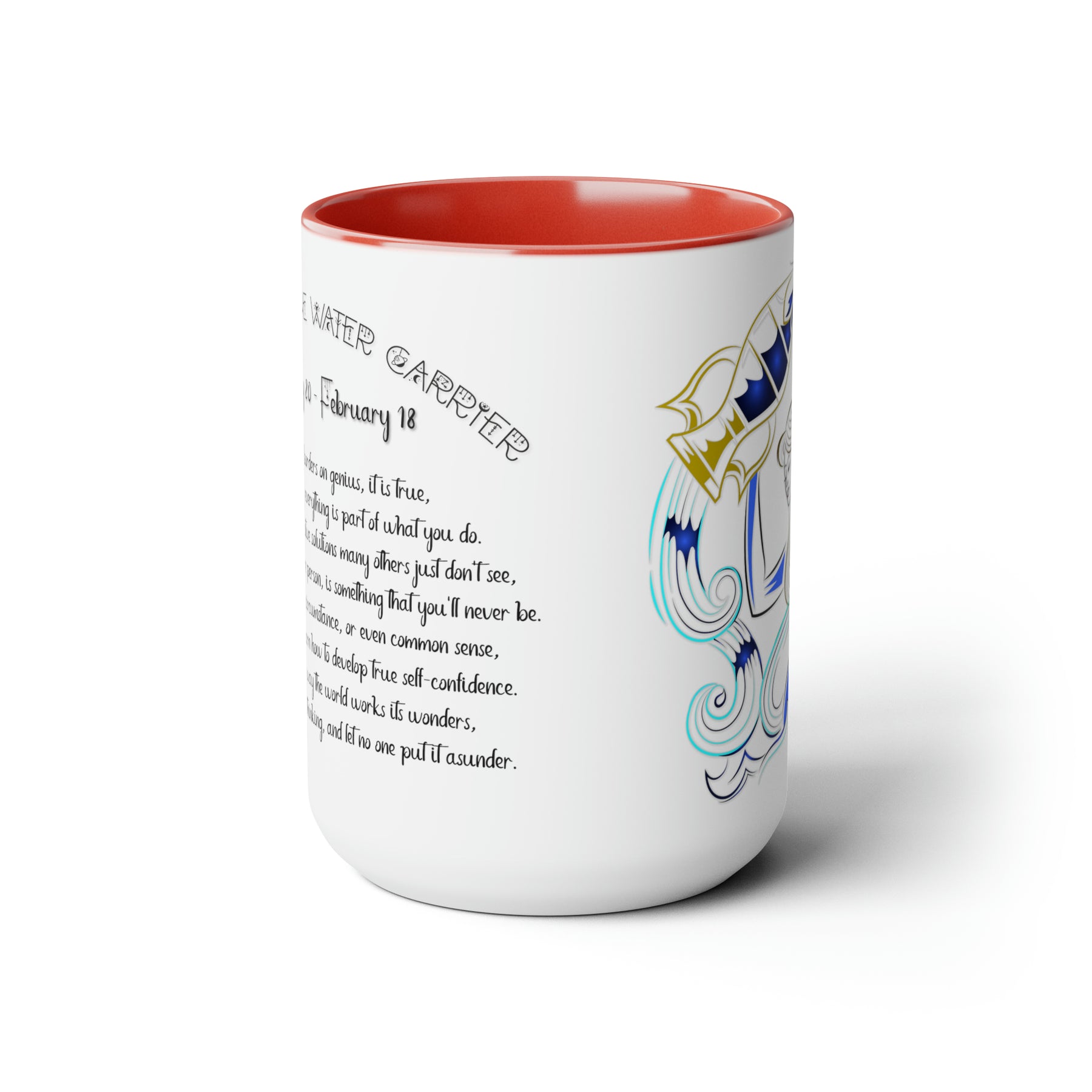 Here to bring big gulps of coffee and style, our Written in the Stars two-tone coffee mugs help people around the world start the day just right. This mug has an acrostic poem spelling out "Aquarius" with traits and purpose included.