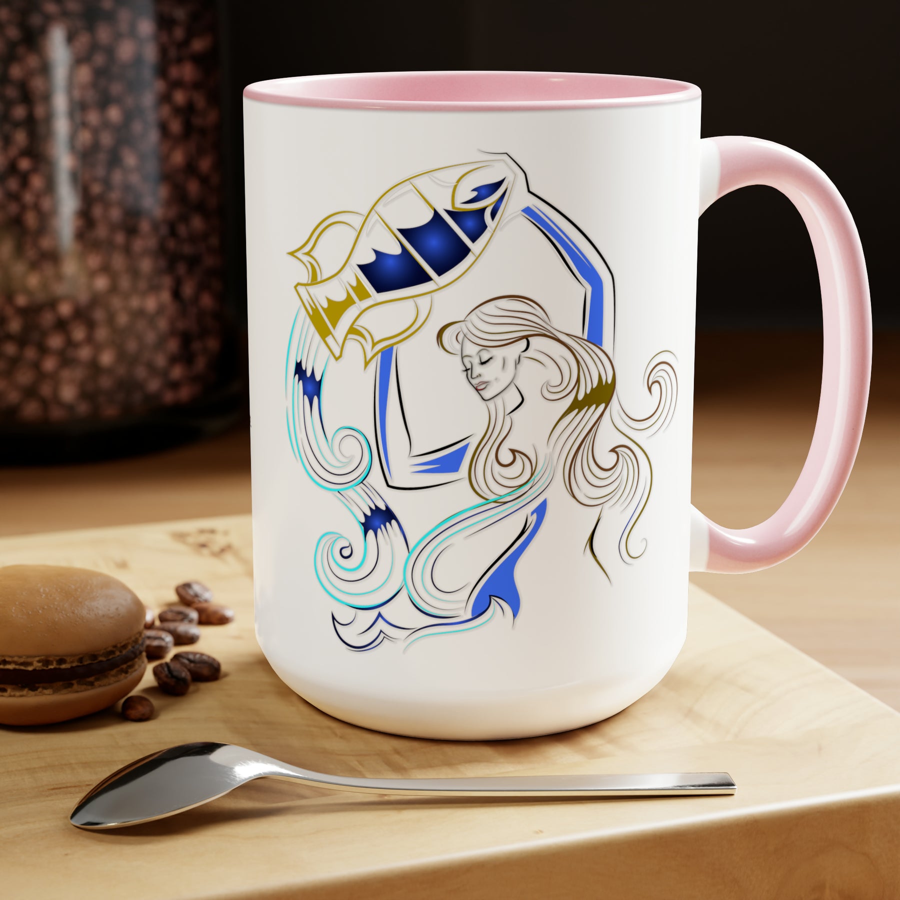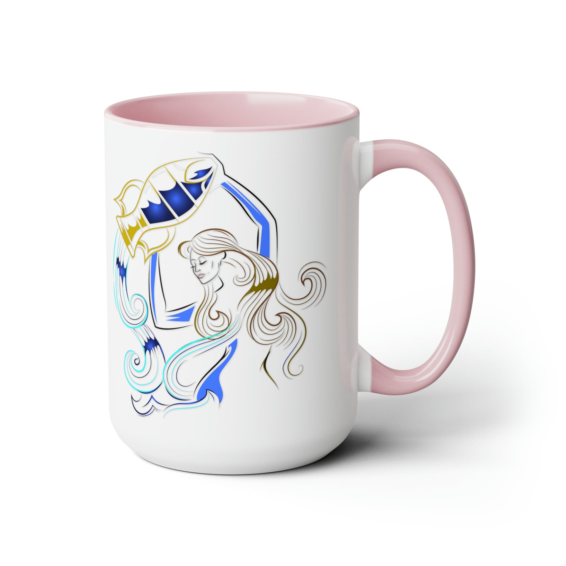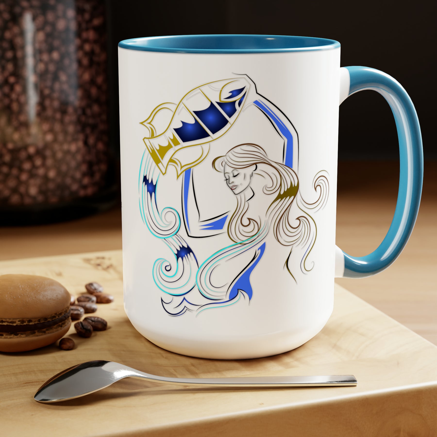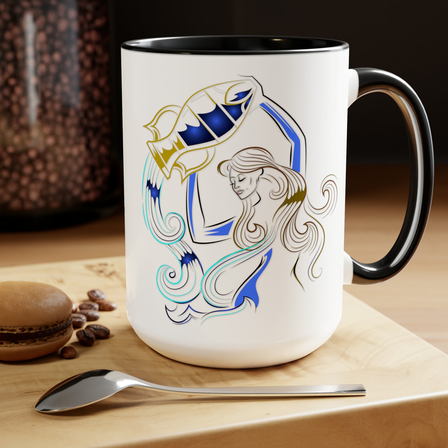 Here to bring big gulps of coffee and style, our Written in the Stars two-tone coffee mugs help people around the world start the day just right. This mug has an acrostic poem spelling out "Aquarius" with traits and purpose included.