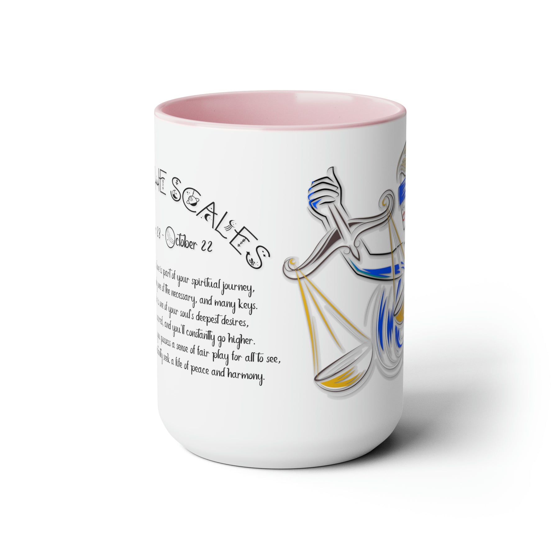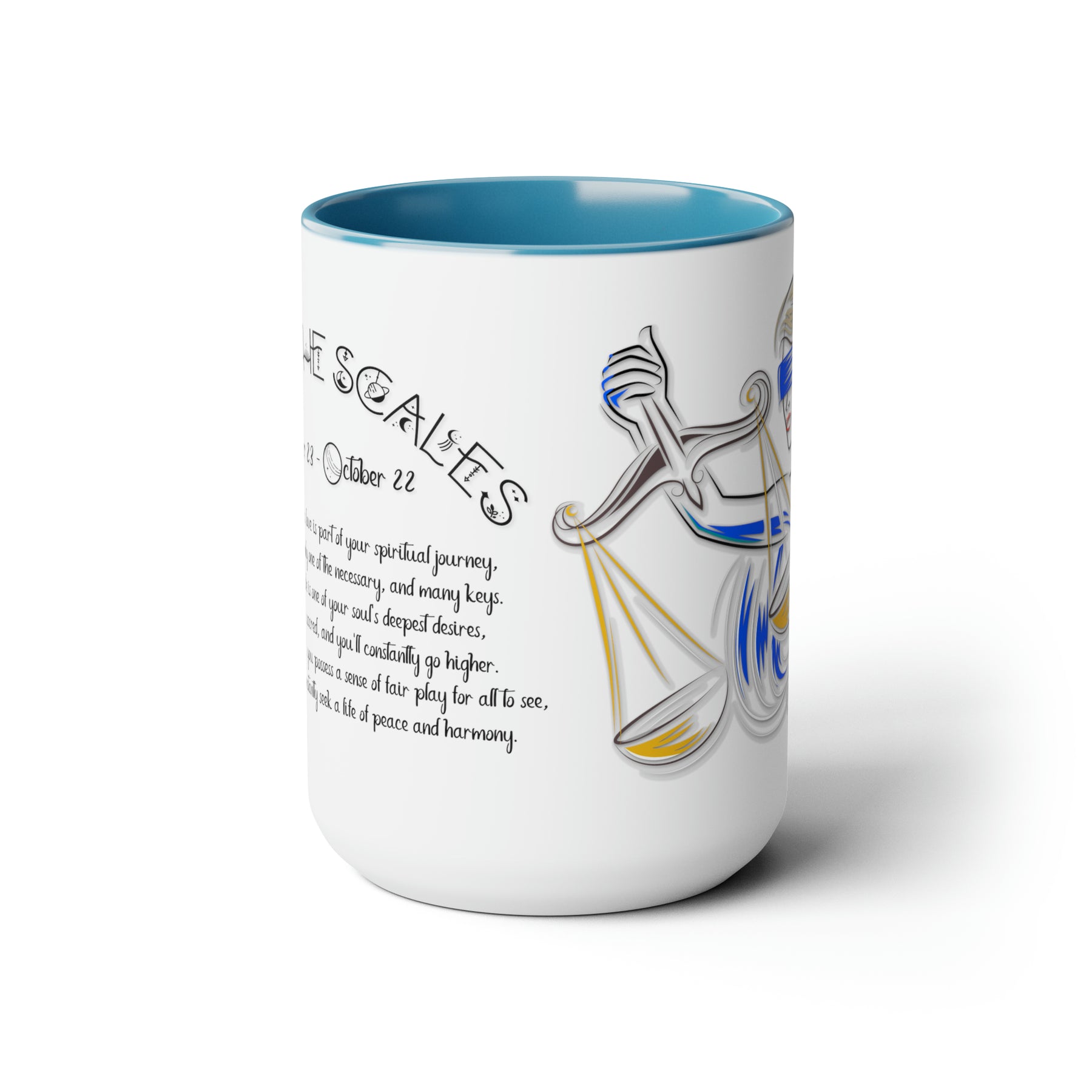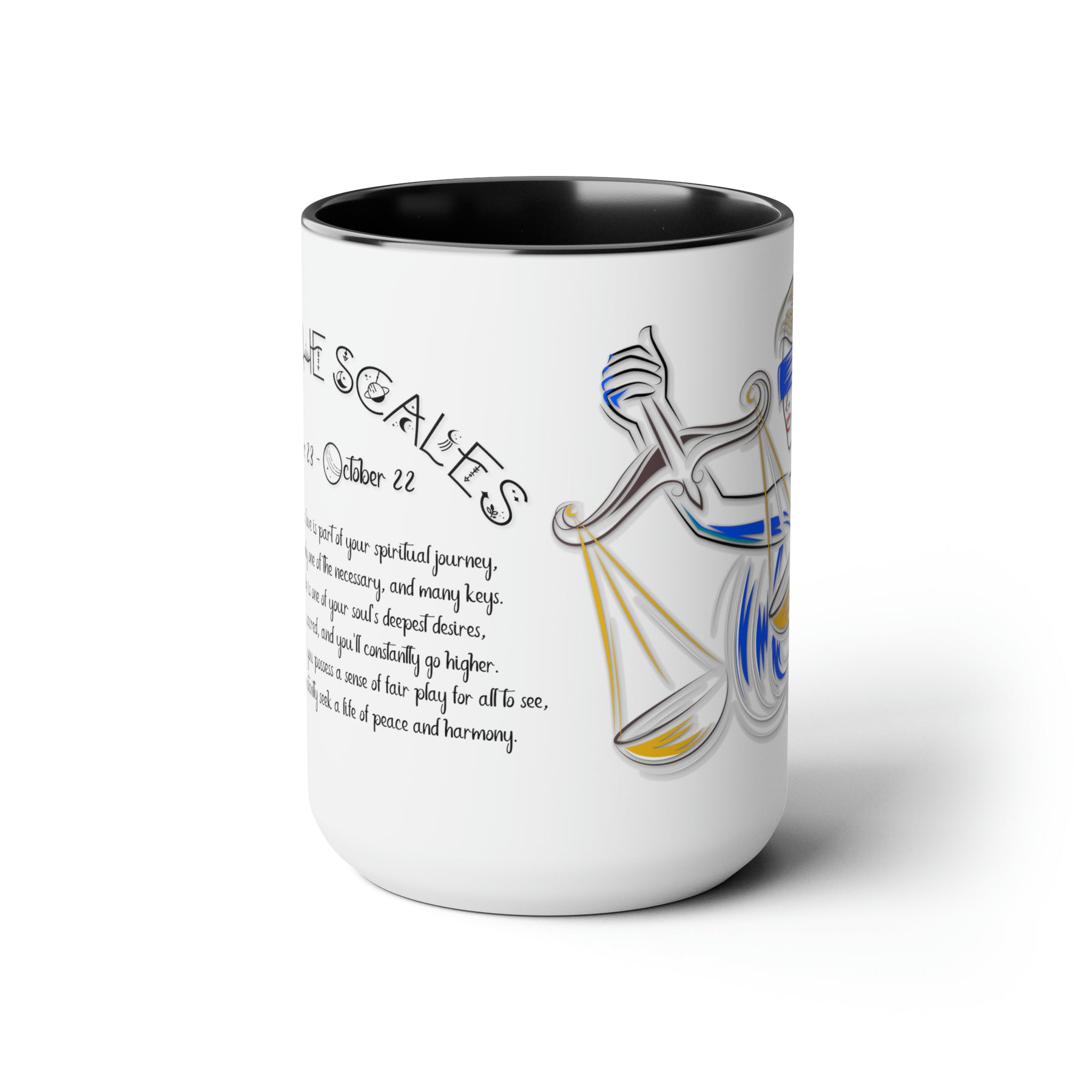 Here to bring big gulps of coffee and style, our Written in the Stars two-tone coffee mugs help people around the world start the day just right. This mug has an acrostic poem spelling out "Libra" with traits and purpose included.