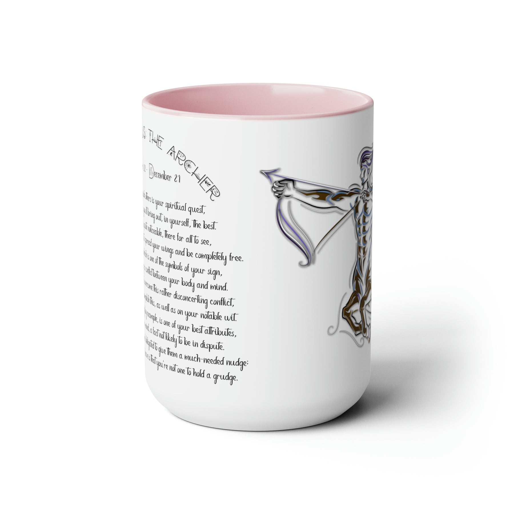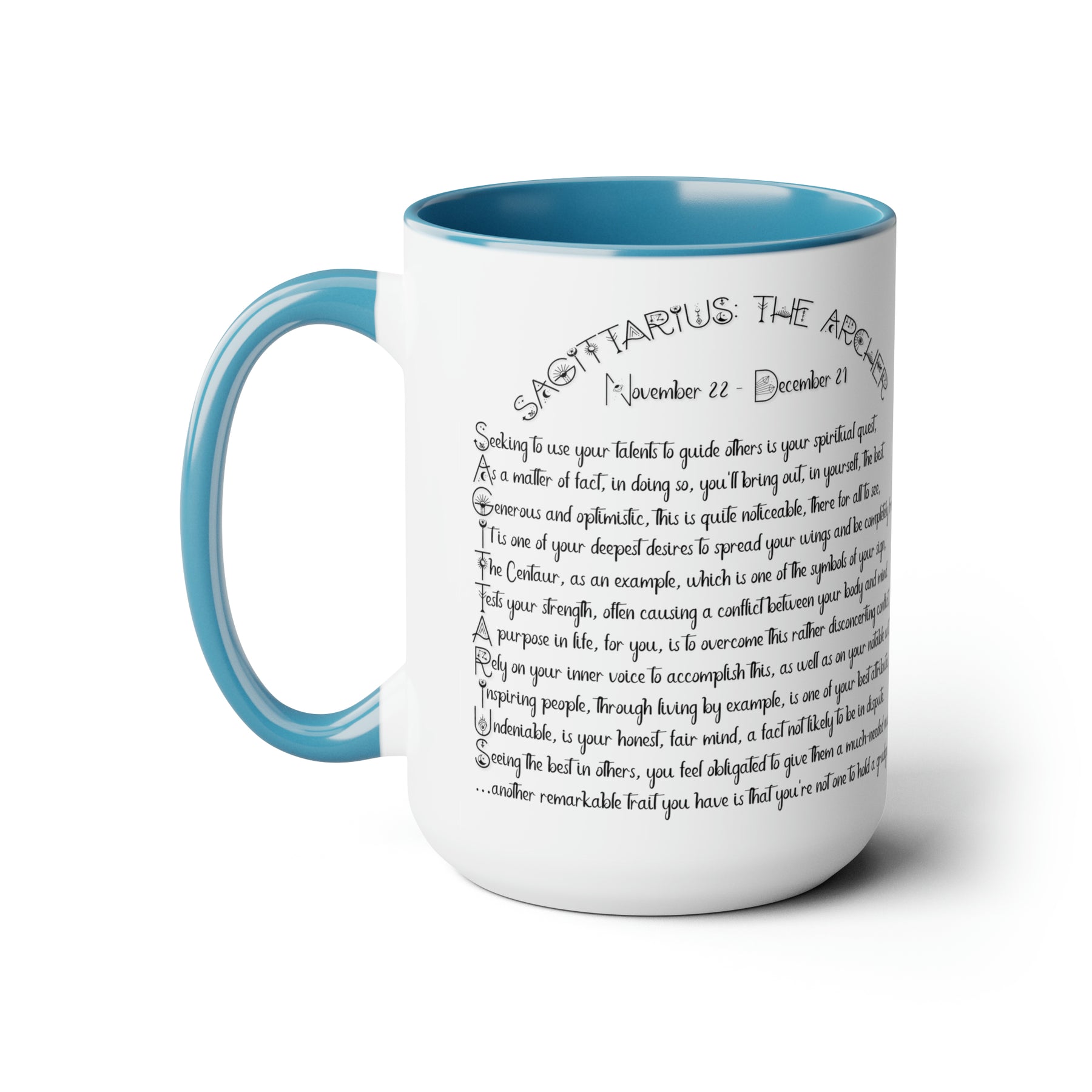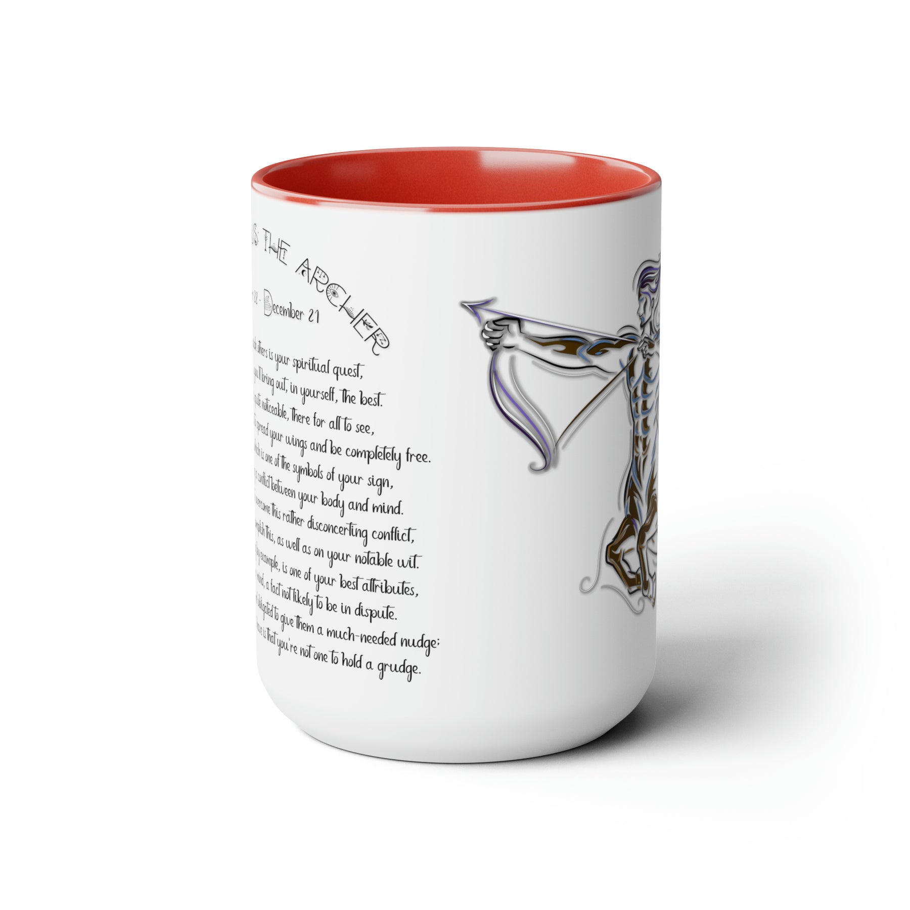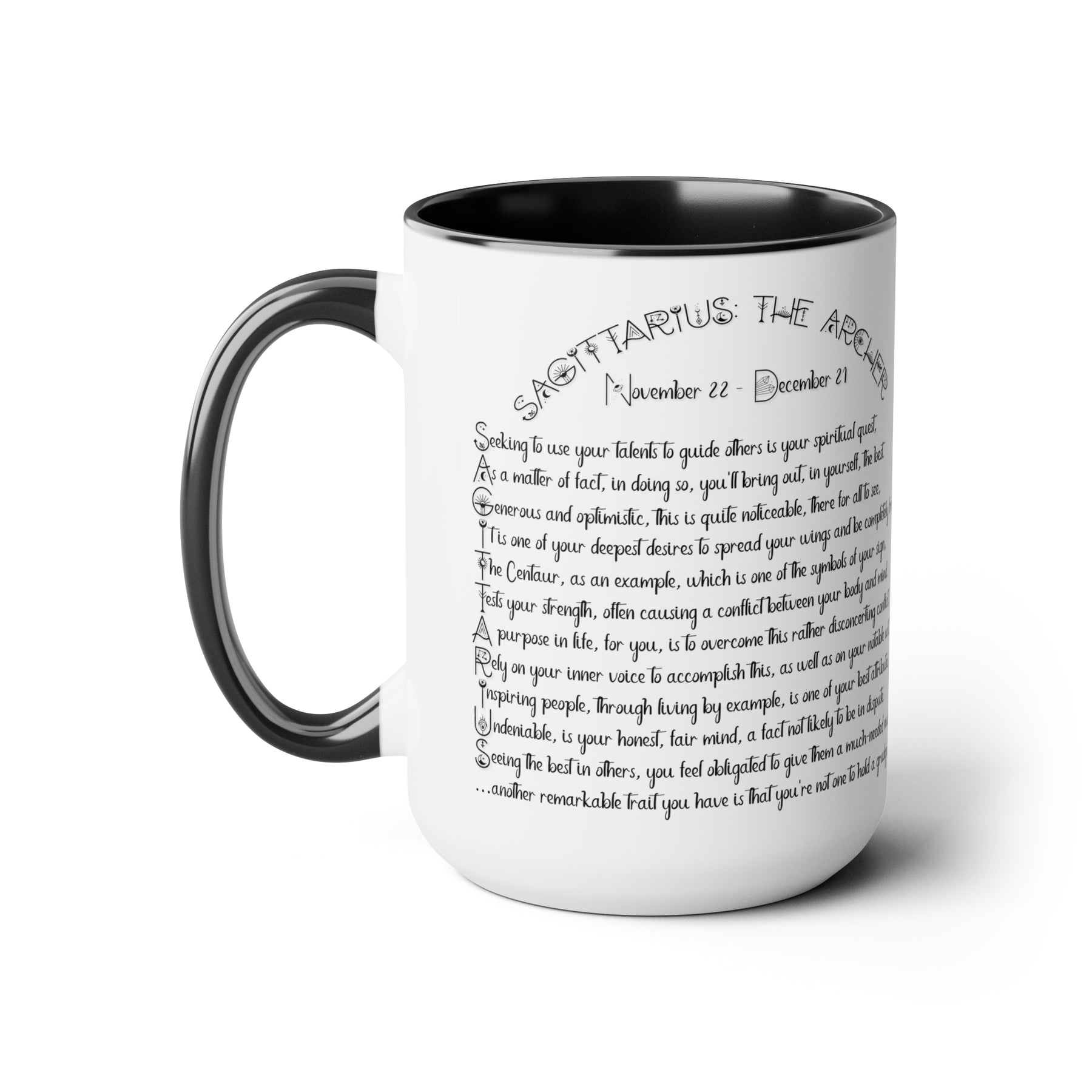 Here to bring big gulps of coffee and style, our Written in the Stars two-tone coffee mugs help people around the world start the day just right. This mug has an acrostic poem spelling out "Sagittarius" with traits and purpose included.