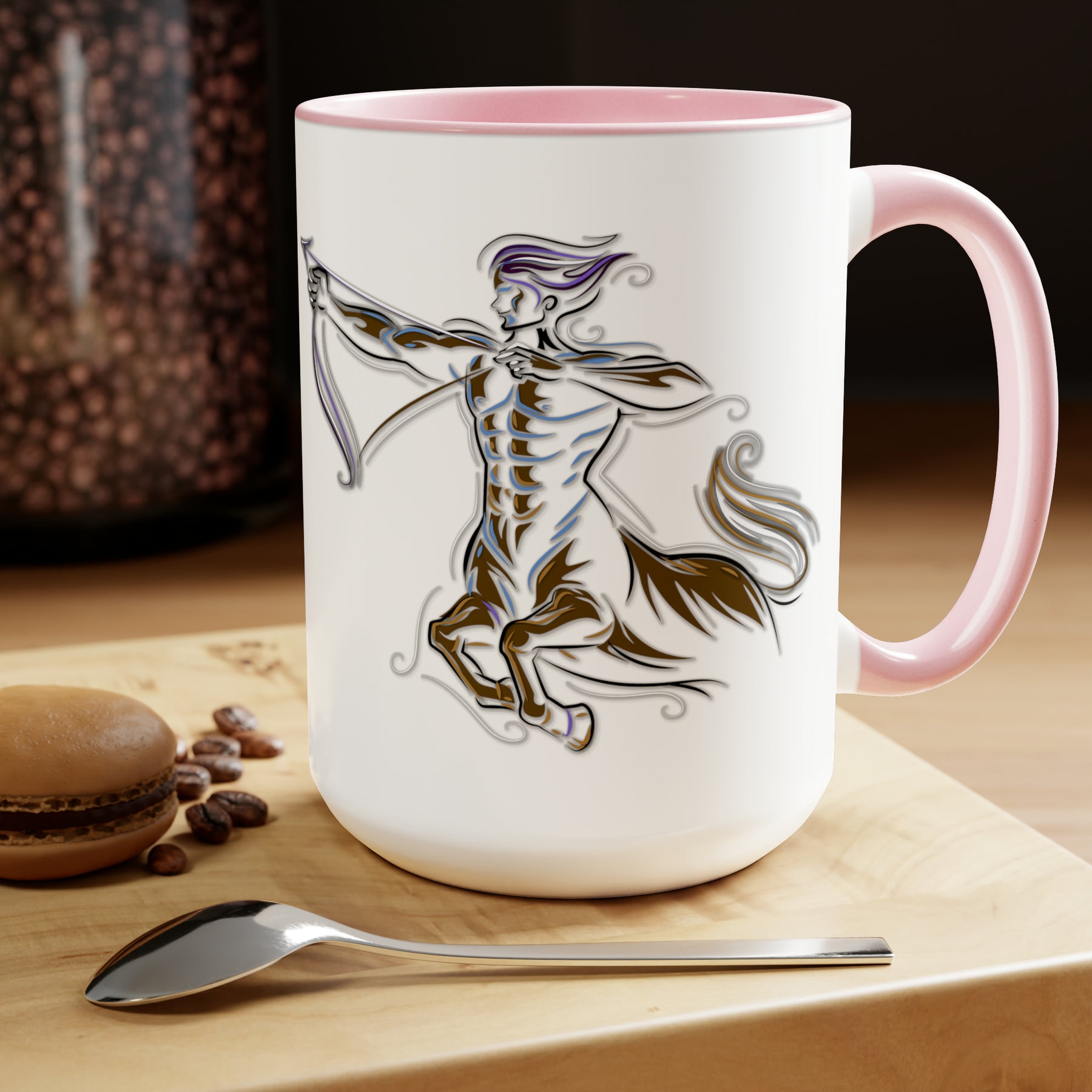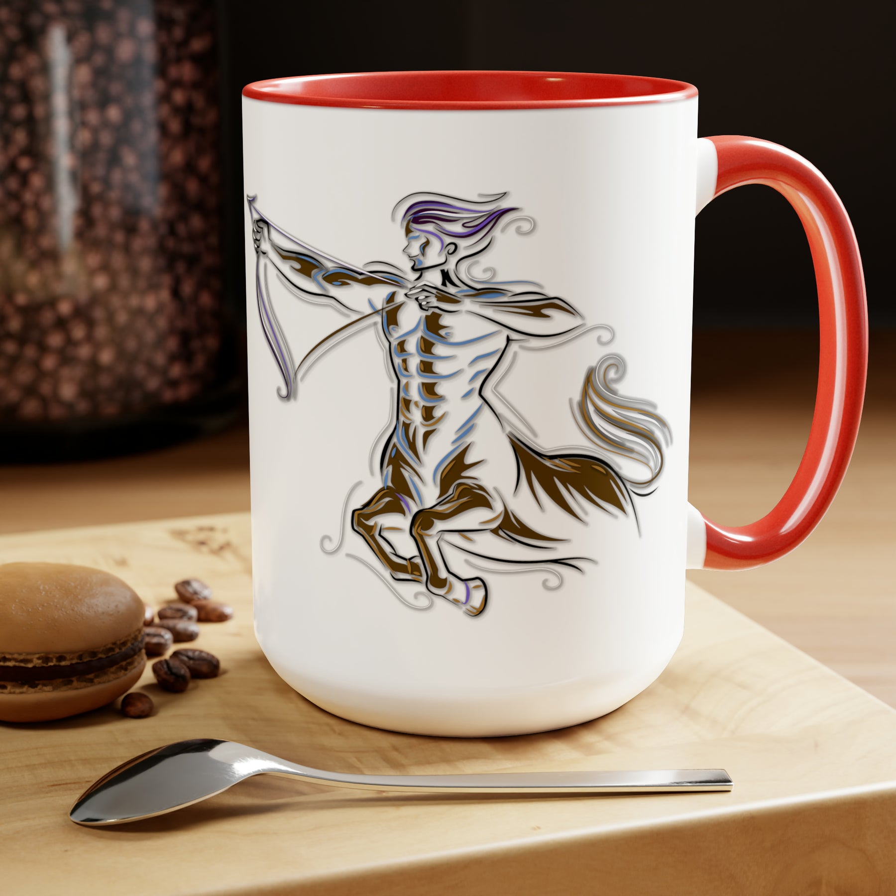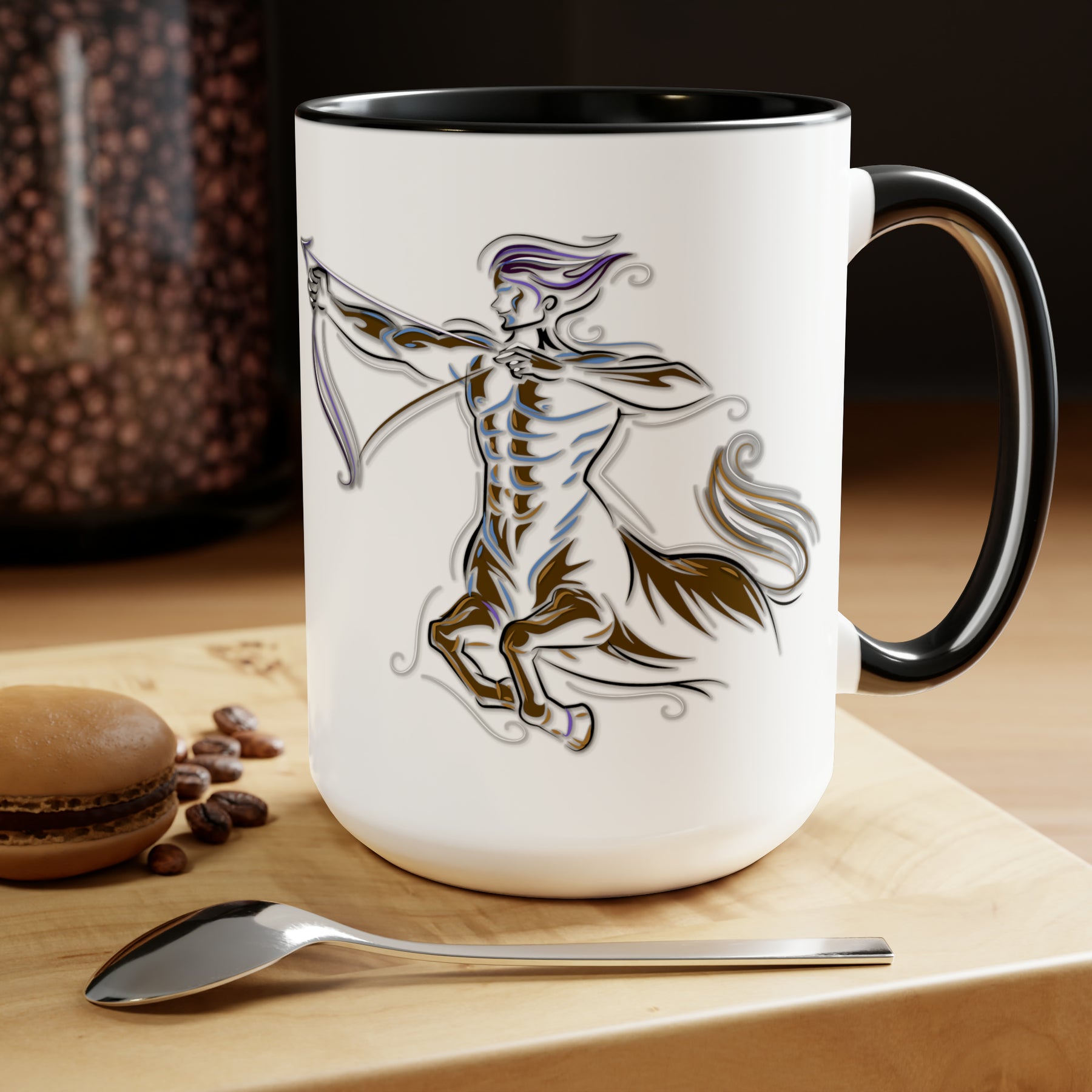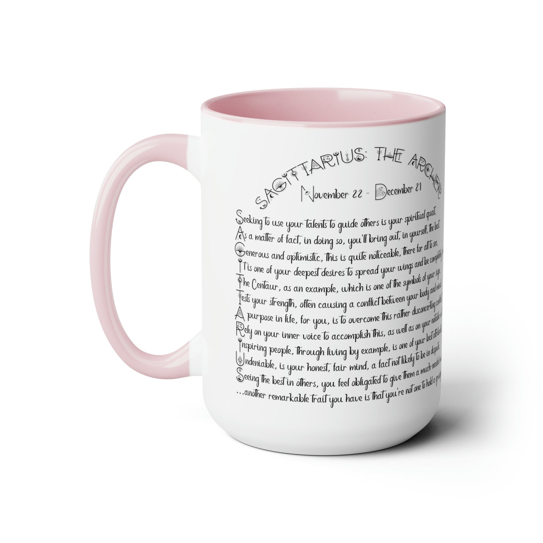Here to bring big gulps of coffee and style, our Written in the Stars two-tone coffee mugs help people around the world start the day just right. This mug has an acrostic poem spelling out "Sagittarius" with traits and purpose included.