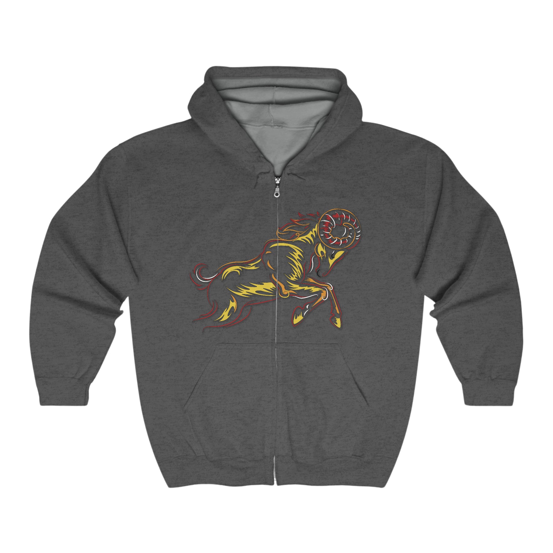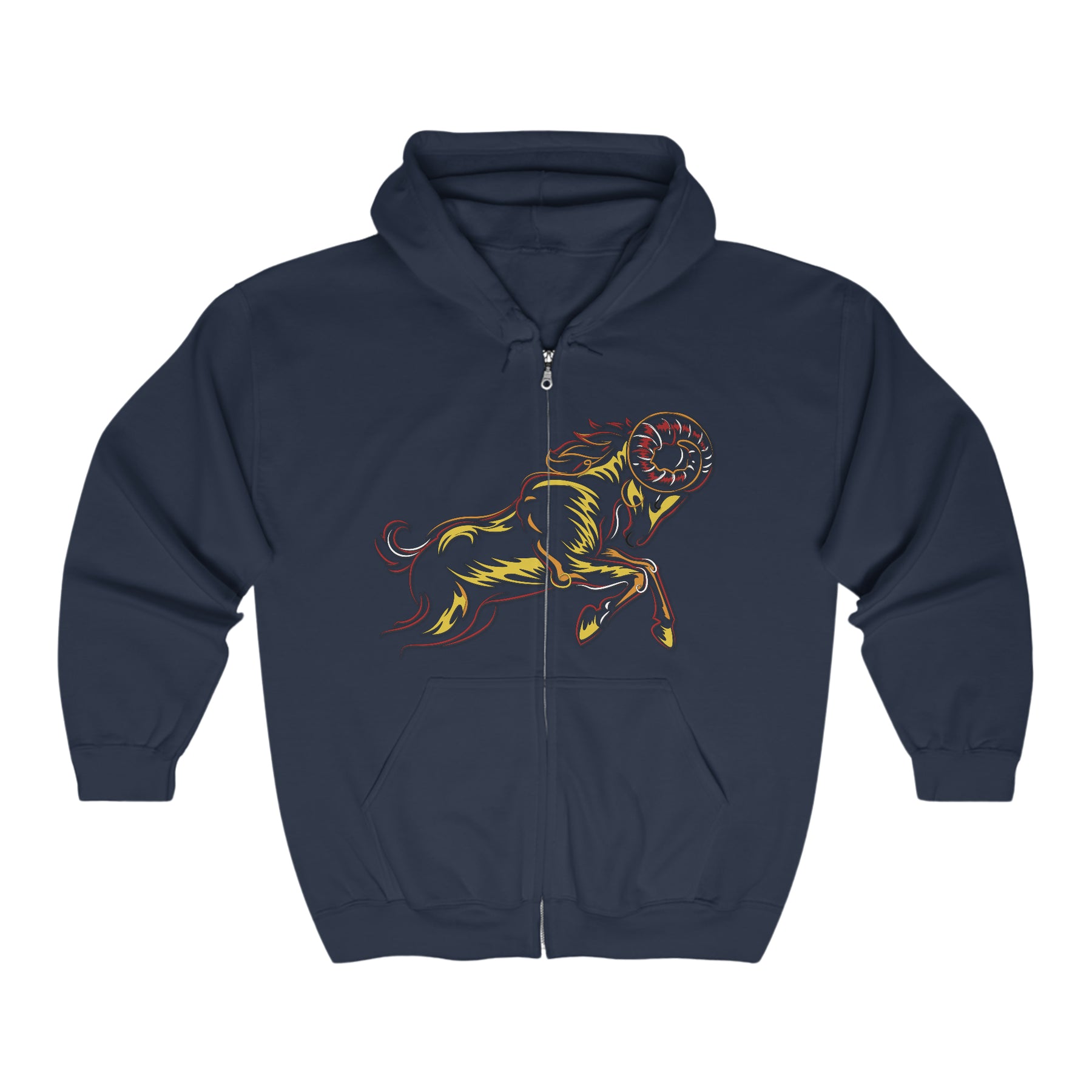 Discover the Written in the Stars Aries acrostic poem Unisex Full Zip Hooded Sweatshirt from Moments in Rhyme. This classic, comfortable zip-up is crafted with air-jet spun yarn for a soft, pilling-resistant fleece. The back features an acrostic poem spelling out "Aries," highlighting its traits and purpose, accompanied by a striking graphic on the front. You'll find it so cozy, you may never want to take it off.