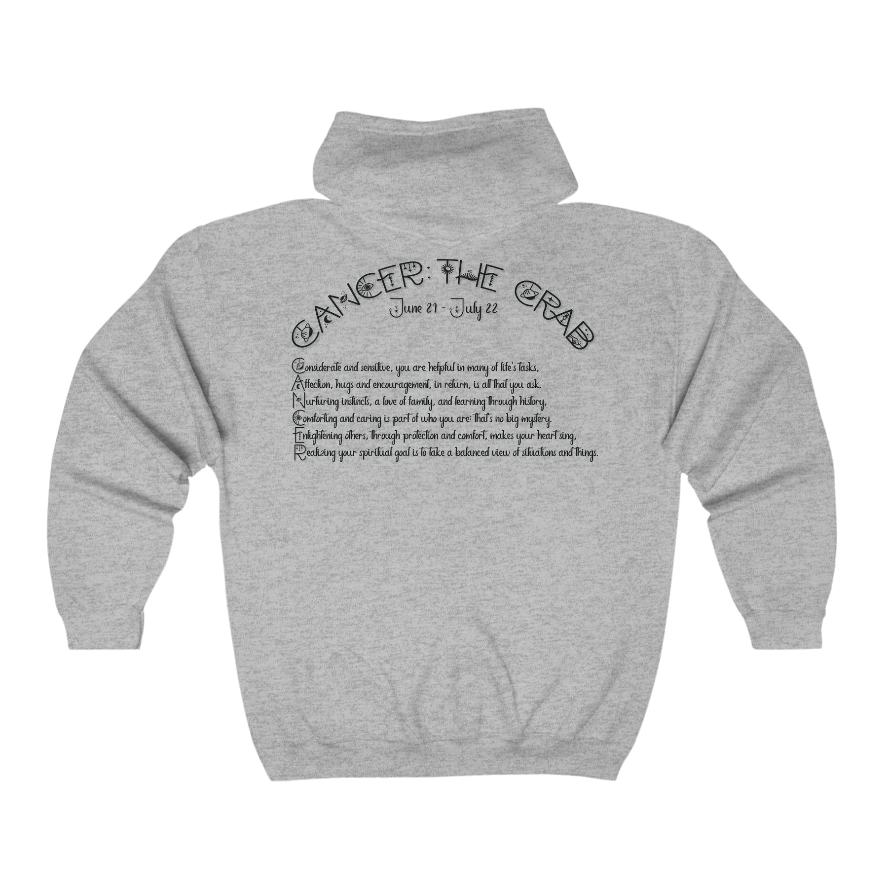 Discover the Written in the Stars Cancer acrostic poem Unisex Full Zip Hooded Sweatshirt from Moments in Rhyme. This classic, comfortable zip-up is crafted with air-jet spun yarn for a soft, pilling-resistant fleece. The back features an acrostic poem spelling out "Cancer," highlighting its traits and purpose, accompanied by a striking graphic on the front. You'll find it so cozy, you may never want to take it off.