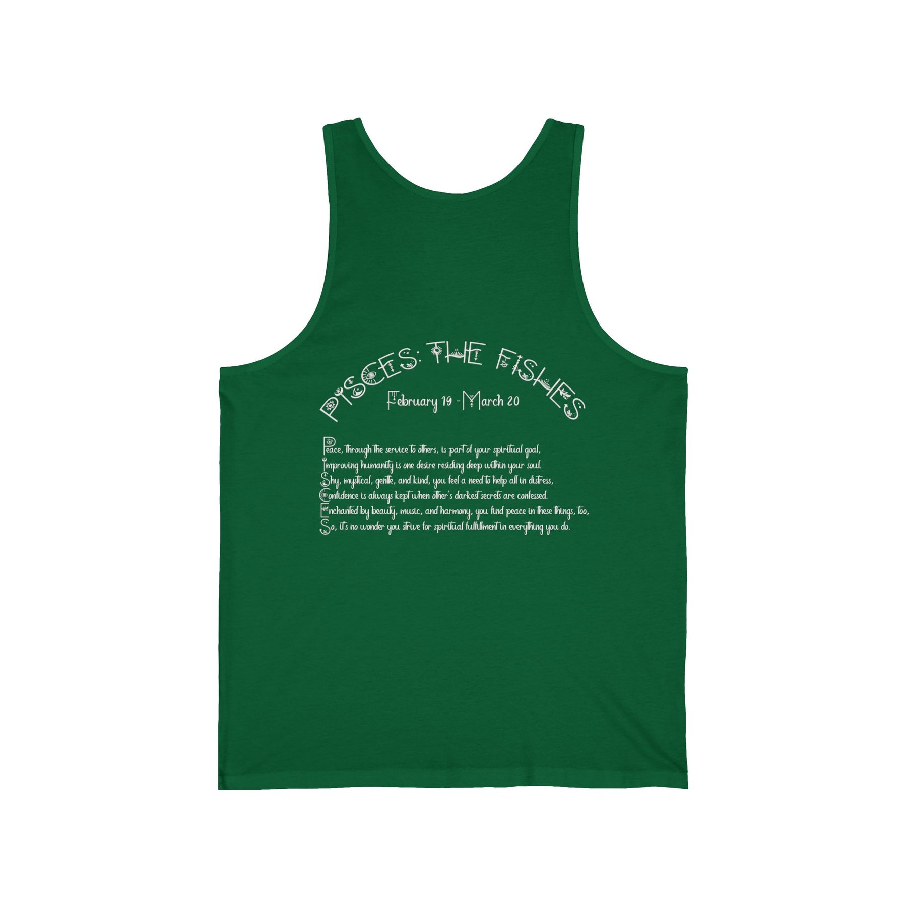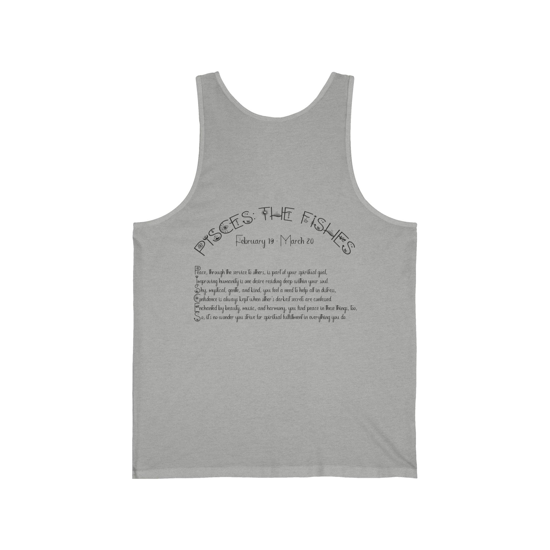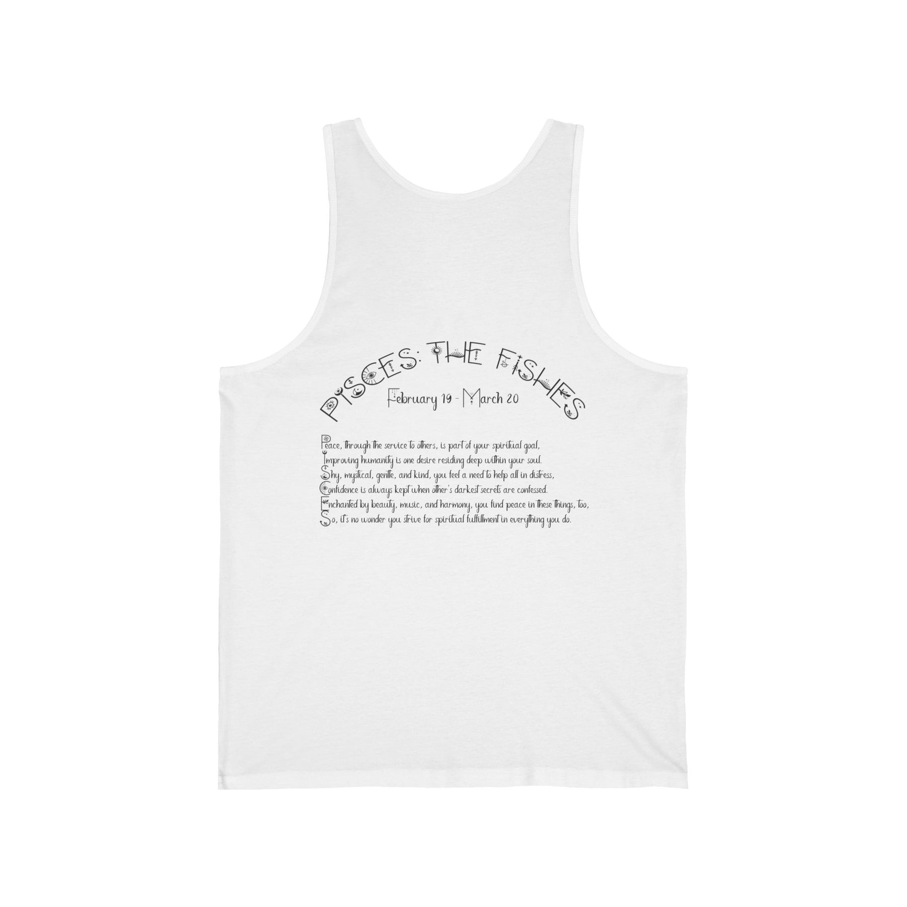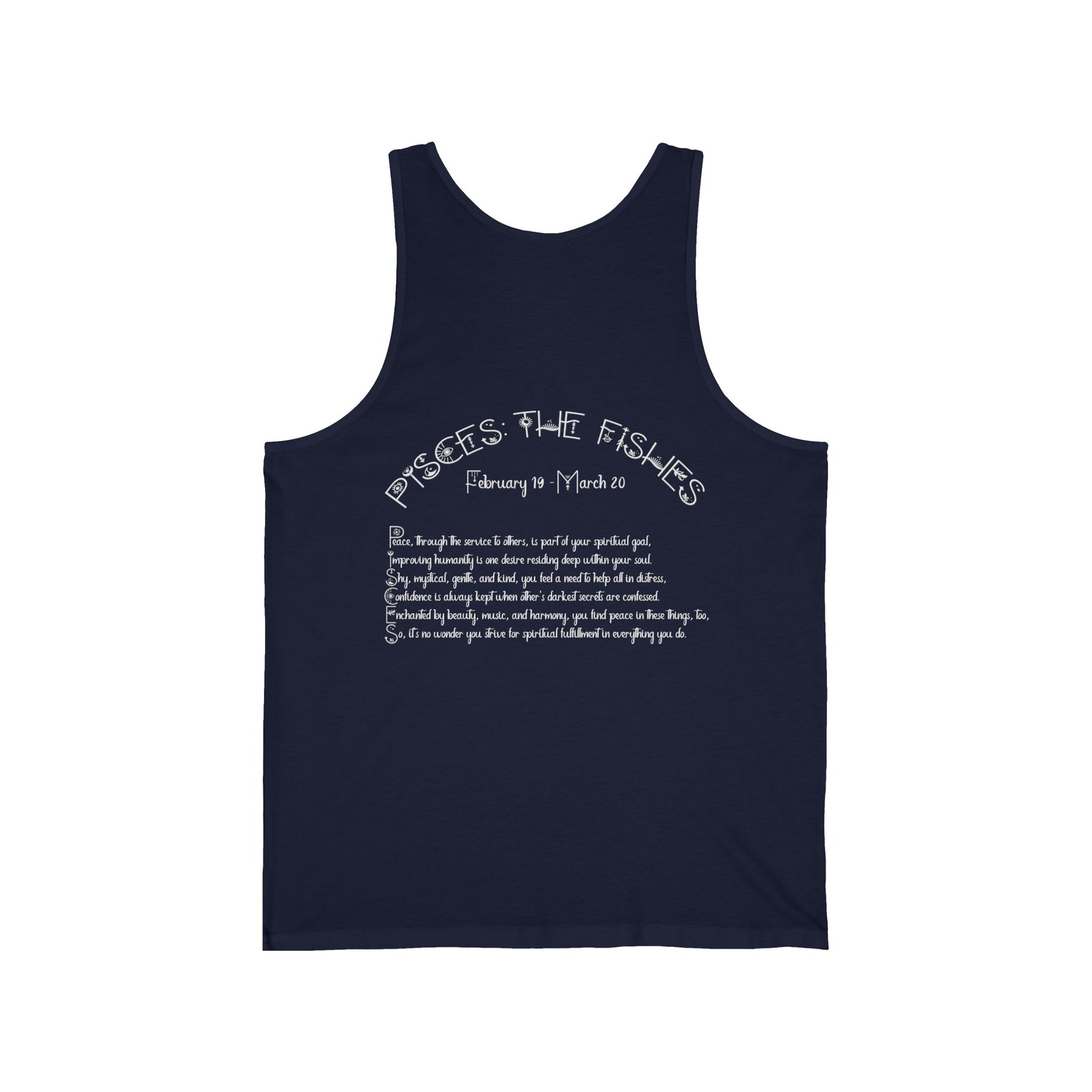 Feel like a star in our "Written in the Stars" must-have unisex jersey tank top with an acrostic poem on the back featuring traits of Pisces the Fishes. The high-quality print makes it a statement piece for astrology lovers. Perfect for adults who enjoy astrology and are looking for a unique gift. Ideal for birthdays, holidays, or any astrology-themed celebrations. Check out the amazing celestial font!