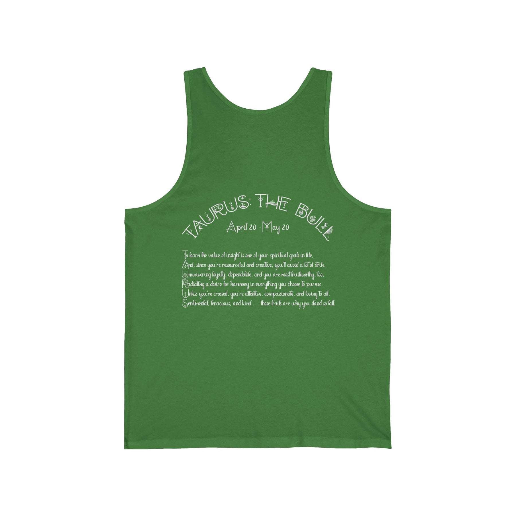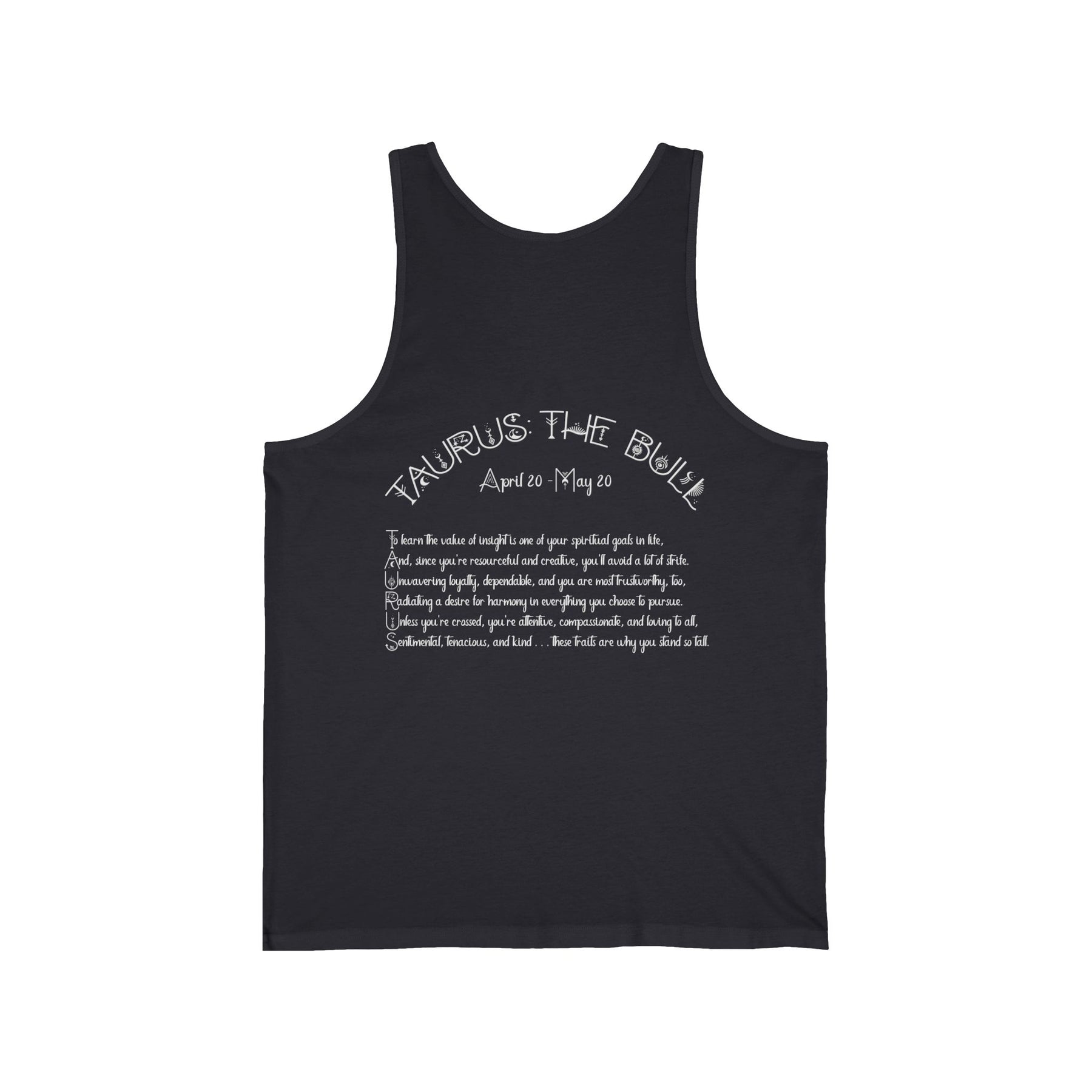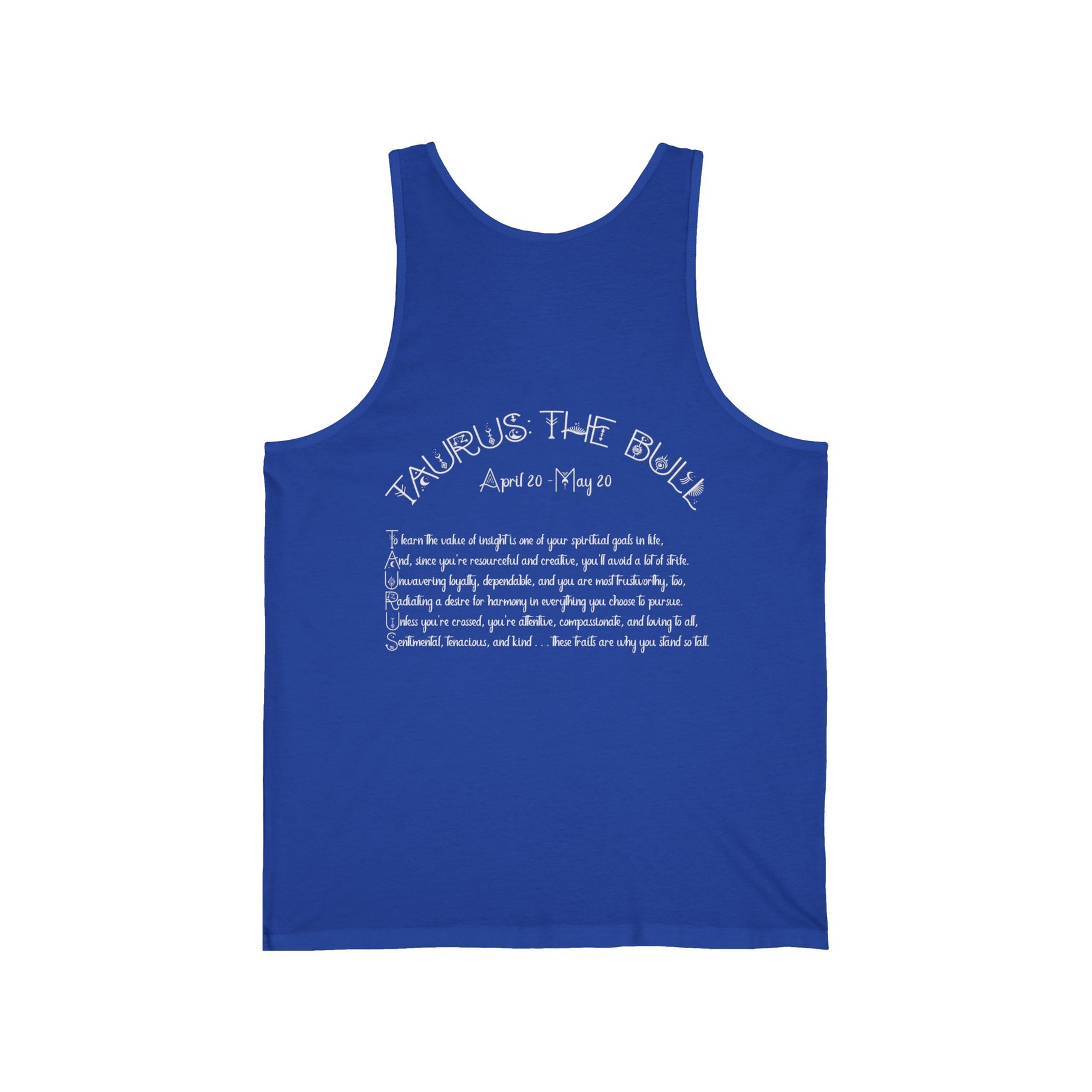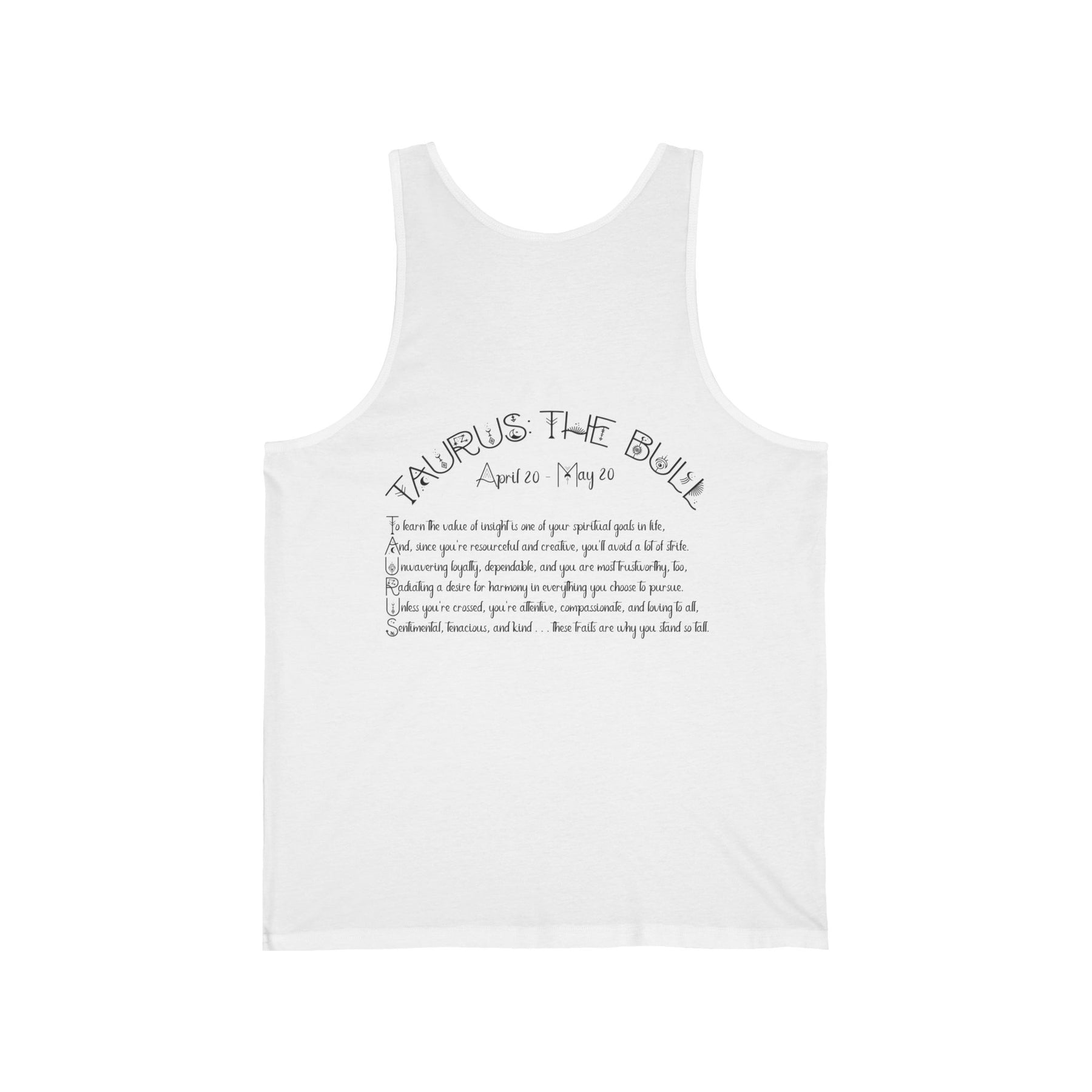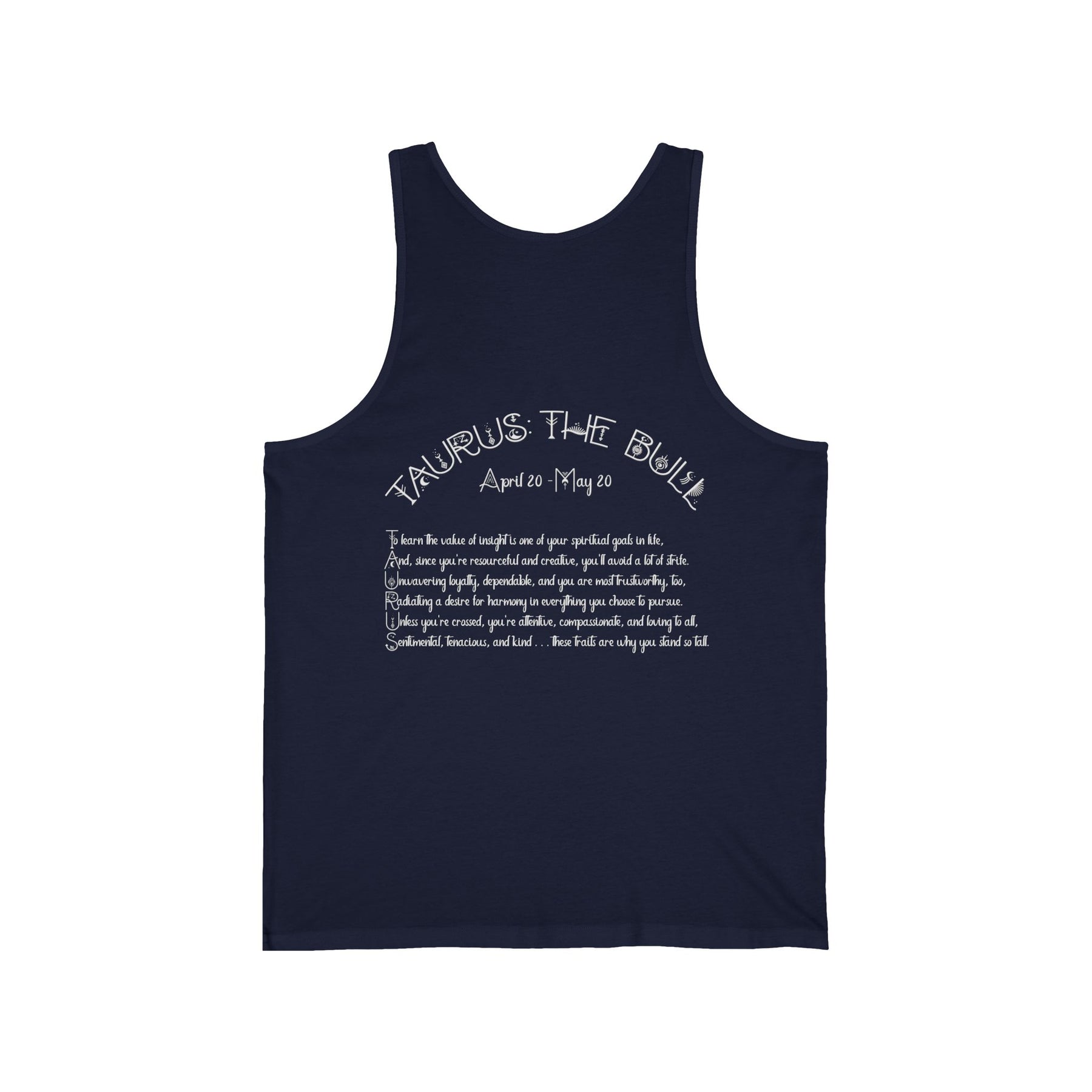 Feel like a star in our "Written in the Stars" must-have unisex jersey tank top with an acrostic poem on the back featuring traits of Taurus the Bull. The high-quality print makes it a statement piece for astrology lovers. Perfect for adults who enjoy astrology and are looking for a unique gift. Ideal for birthdays, holidays, or any astrology-themed celebrations. Check out the amazing celestial font!